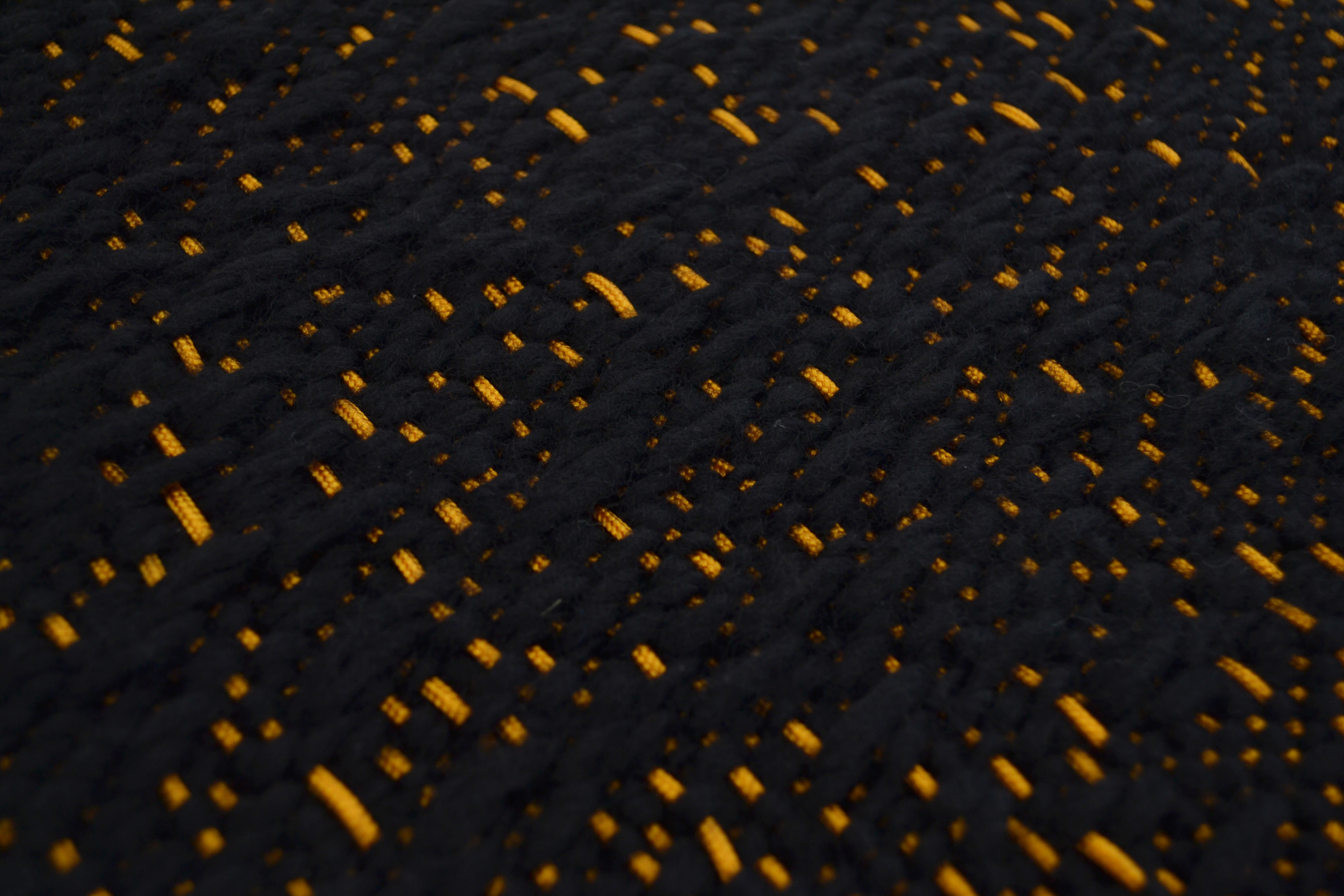 Broken Cipher, Woollen Weave is a woven work investigating the glitch in analogue media, interrogating how spontaneous structural errors can manifest in textiles. While of unknown origin, the term glitch has become almost exclusively associated with the digital realm where it is understood as a spontaneous and random malfunction of soft- or hardware.1 In the academic canon, it is argued that glitches expose the inner workings of encrypted technology, reminding the user that even technology programmed for perfection has potential for error. In Jakko Kemper’s writing on the subject, glitches additionally affect the user experience of the digital realm through their exposure of technology’s opacity and fallibility. Through this structural definition, glitches have become a key feature of digital and new media art; their application in analogue art forms, however, remains almost exclusively aesthetic.2 The use of the glitch as an pictorial aesthetic fails to consider the underlying logic shared by both digital environments and textile arts - one of the binary, of 1s and 0s, and of a clear over or under of the weft thread. As the over and under of the weft thread is often abstracted into black and white pixels to communicate a specific weave pattern to machines and other human weavers they offer an opportunity to introduce image-based glitches, randomising the distribution of pixels in the pattern. As the automation of textile manufacture has rendered the random occurrence of errors basically impossible, imperfections in fabrics can only be produced by and are understood solely as a mark of the human hand. The notational patterns of tabby and twill weave, two of the most common and simplest patterns, were gradually randomised in a Grasshopper script. The resulting pattern notation was woven by hand on a frame loom, producing a 60 x 100 cm fabric of black wool and orange paracord. The shift in scale of the materials from thread to string reveals both the original unaltered structure of tabby and twill weave and the imperfections of the glitch, with colours chosen for their similarity to the early plasma screen of the 80s. In the final tapestry, the glitch is thus transformed into a tactile manifestation of structural nature within the fabric.