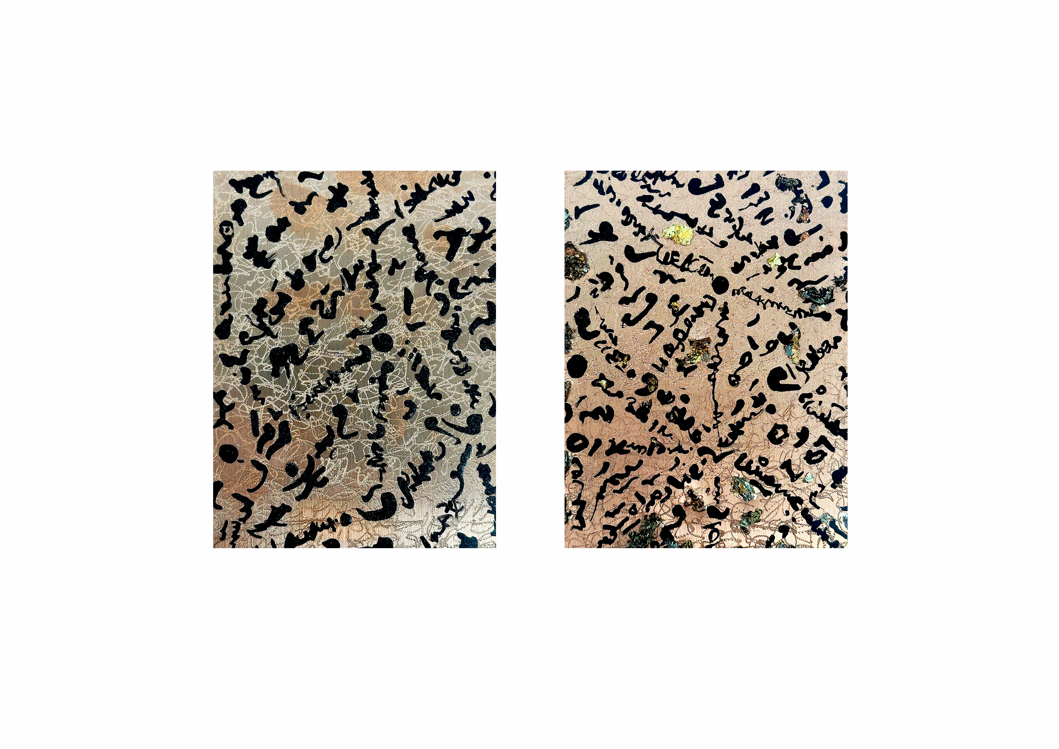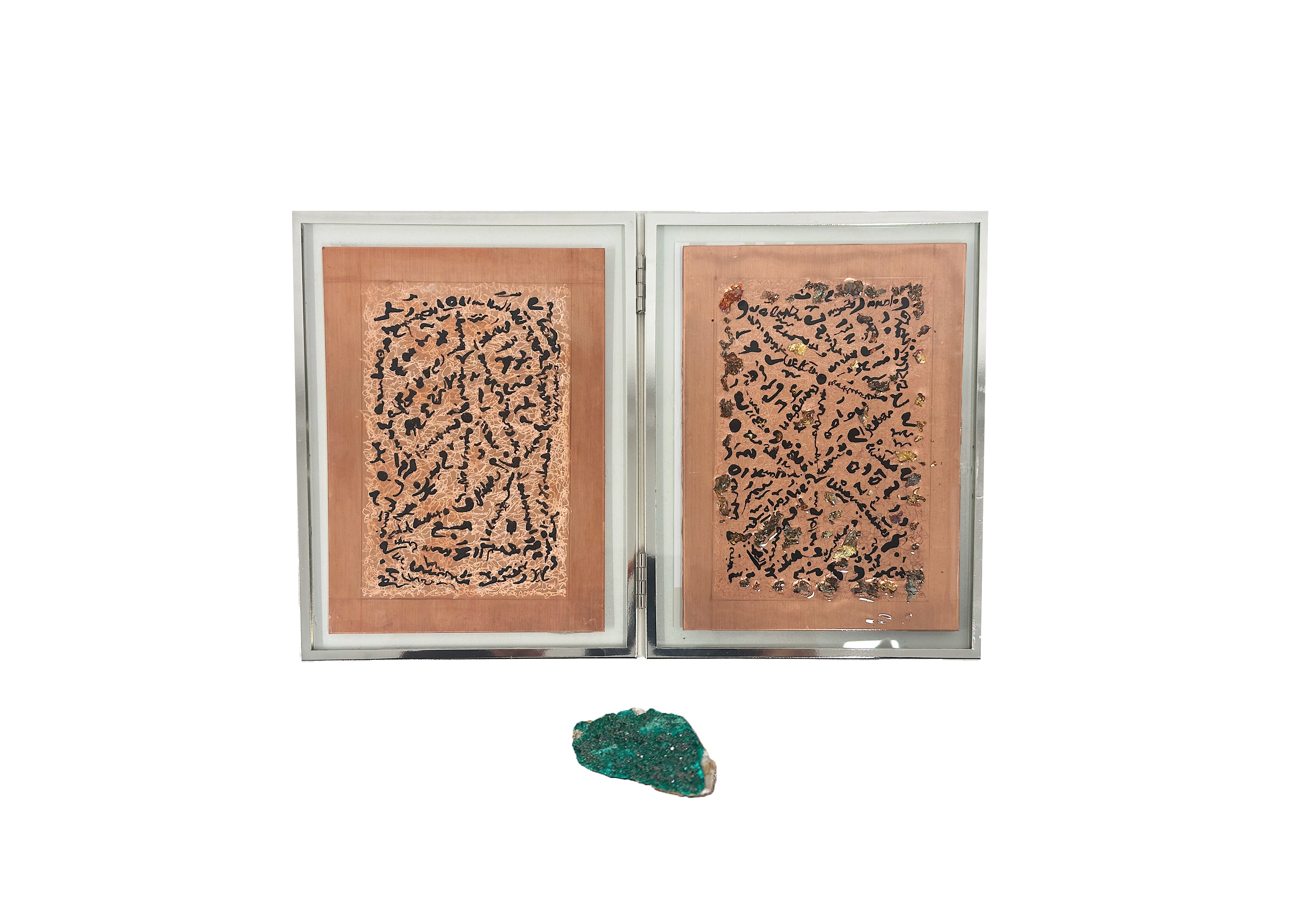 Ecliptic Fragments delves into the nuanced interplay between memory, resilience, and rupture through the lens of copper and Chrysocolla, challenging and redefining the narratives of displacement and identity. This project delves into the liminal zones of borders, perceived as both fragile constructs and transformative spaces where control is challenged, and humanity endures. Employing asemic writing and a multilayered material approach, the work aims to provoke dialogue, foster empathy, and reclaim the silenced narratives of those displaced by borders.