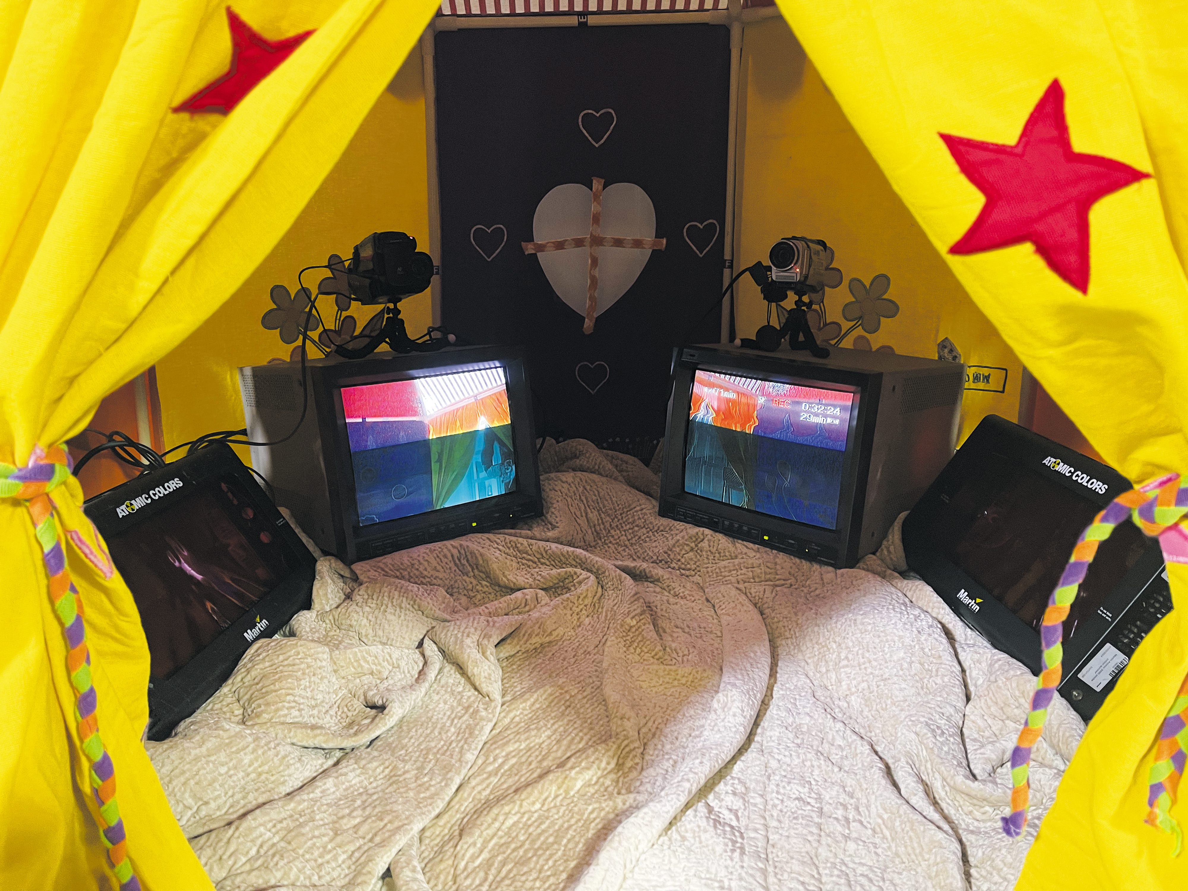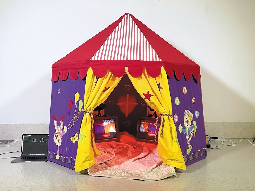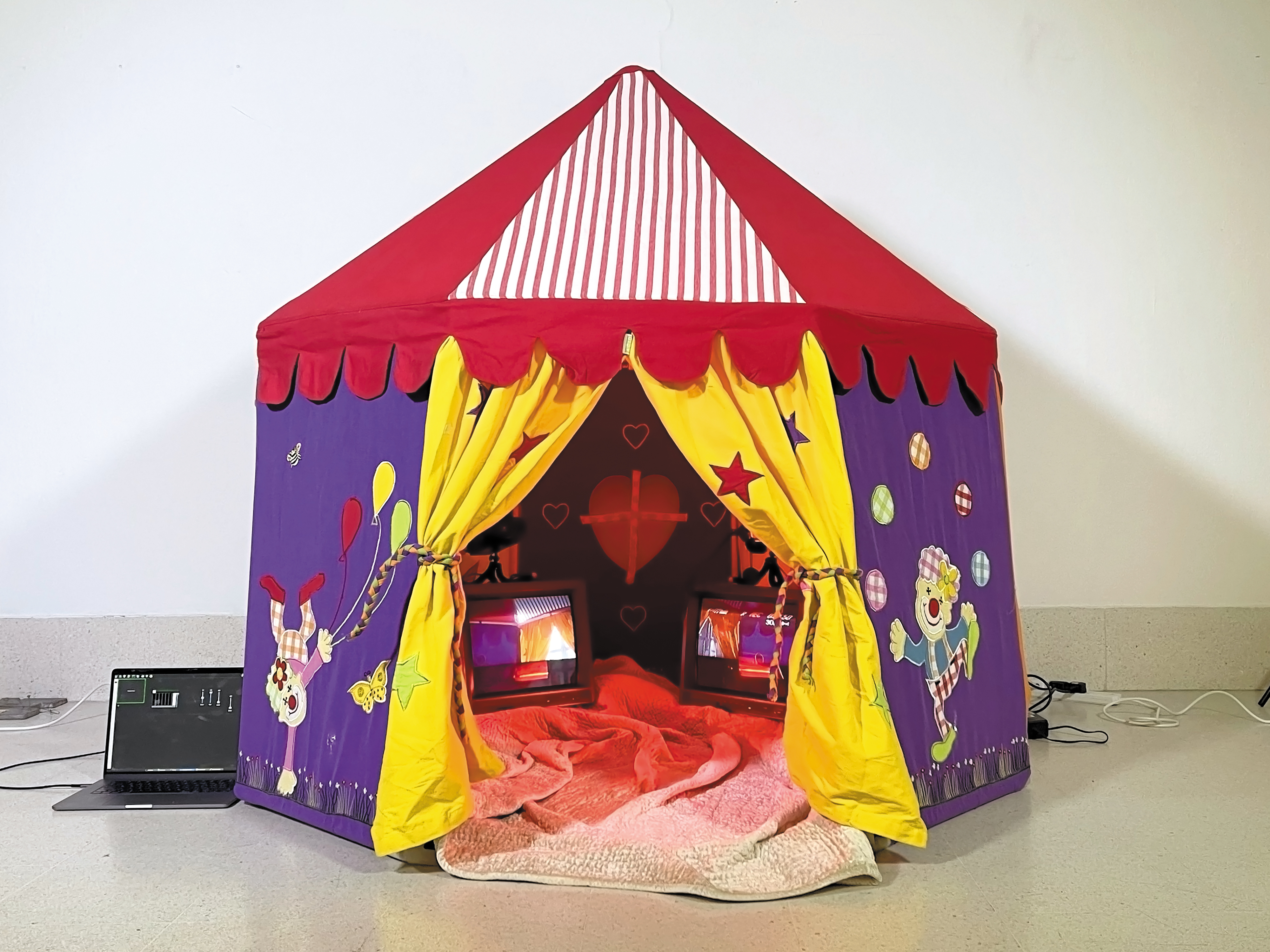 The “Fun-House?” piece addresses the relentless pace of digital overstimulation in a life of a contemporary individual. Toying with Hito Steyerl’s idea of “poor image” saturating everyday existence, the installation reflects on the immediate availability of artificial dopamine through constant and inevitable influx of poorly made “brain rot” content, often wrapped as harmless recreation. By metaphorising rapid flickering of quickly vanishing images, the environment is created where physical forms are replaced with simulation, putting the user into a state of disorientation.