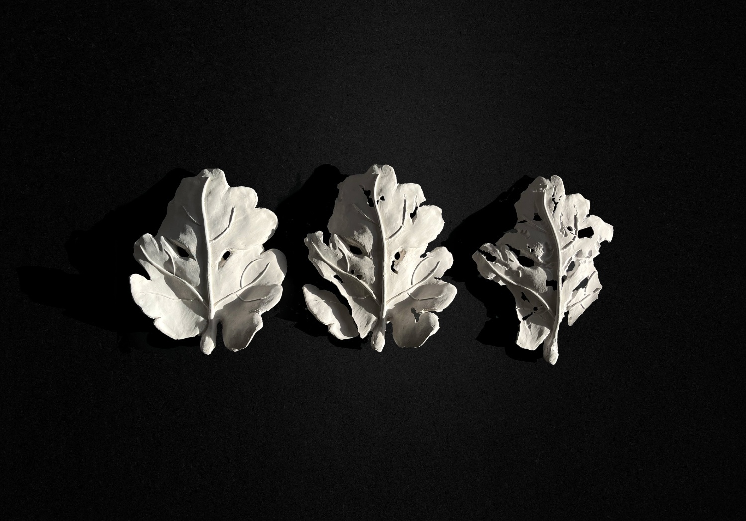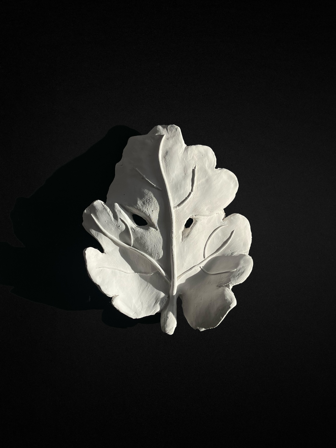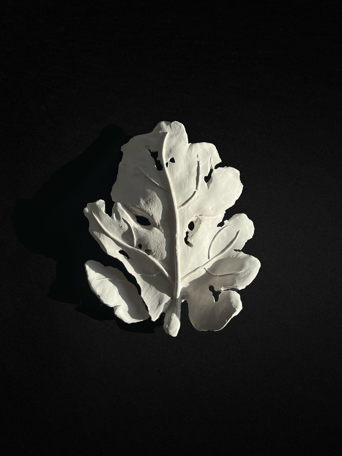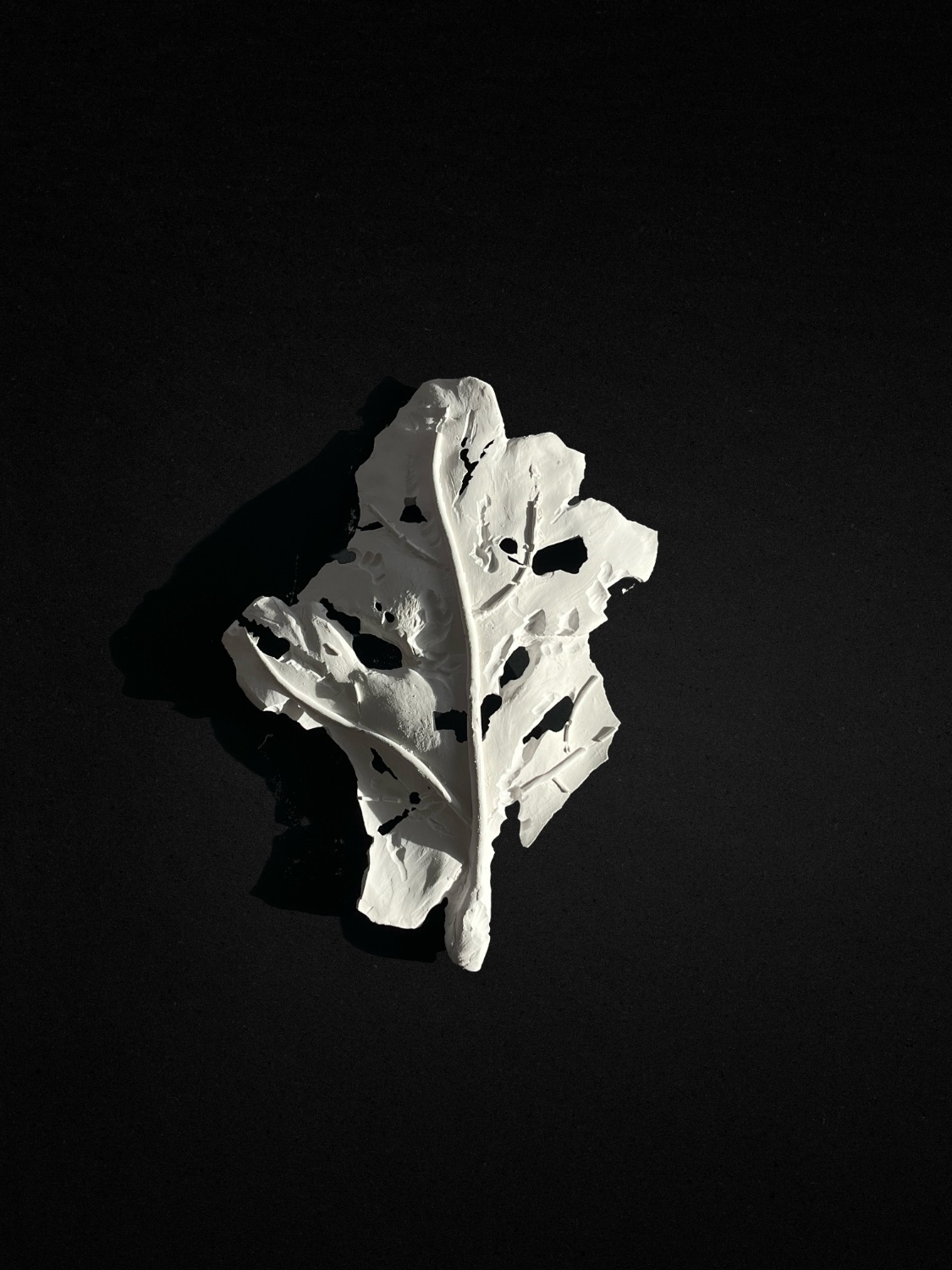 Cast in plaster, Here Lies is a fragile piece that critiques imposed decency. Referencing the fig leaf added to Michelangelo’s David, it symbolizes a history of erased queerness. Through absence and negative space, the work evokes what is suppressed yet lingers. It invites viewers to reflect on queer history and the forces that obscure and erase it.