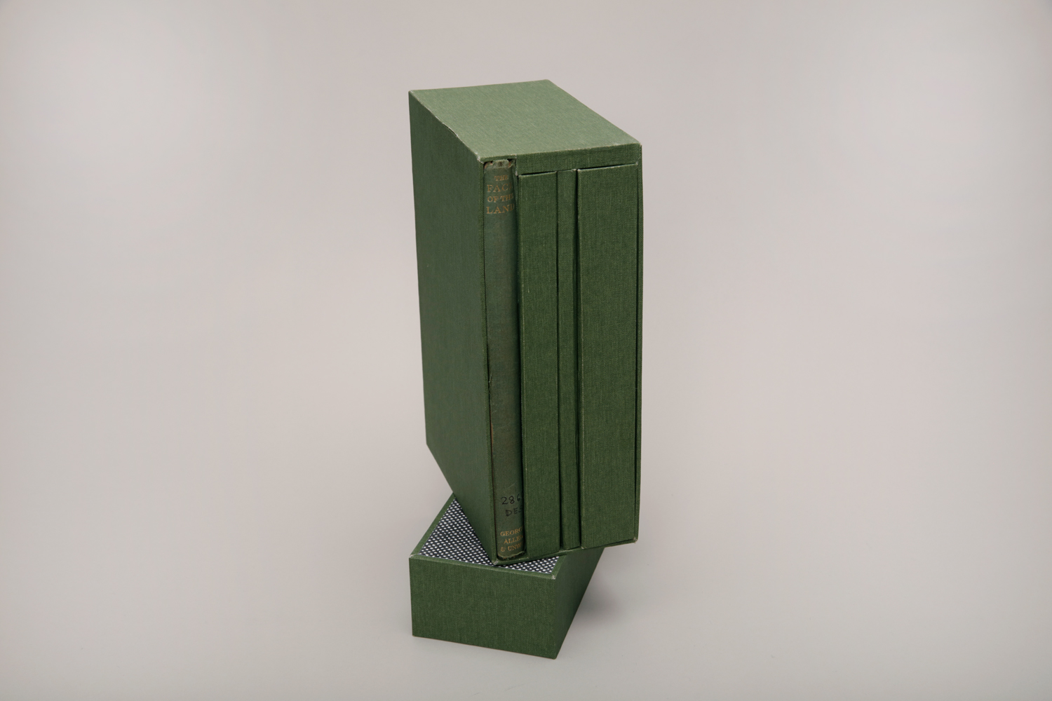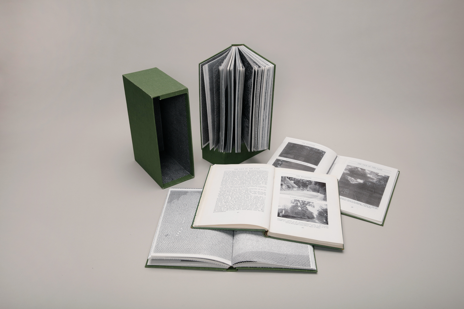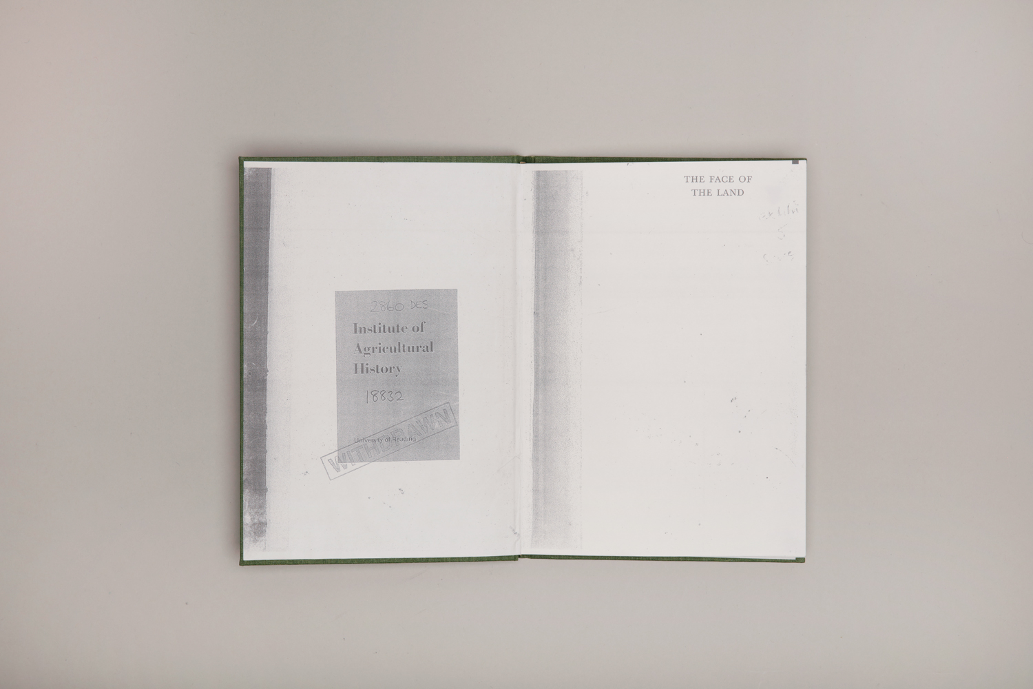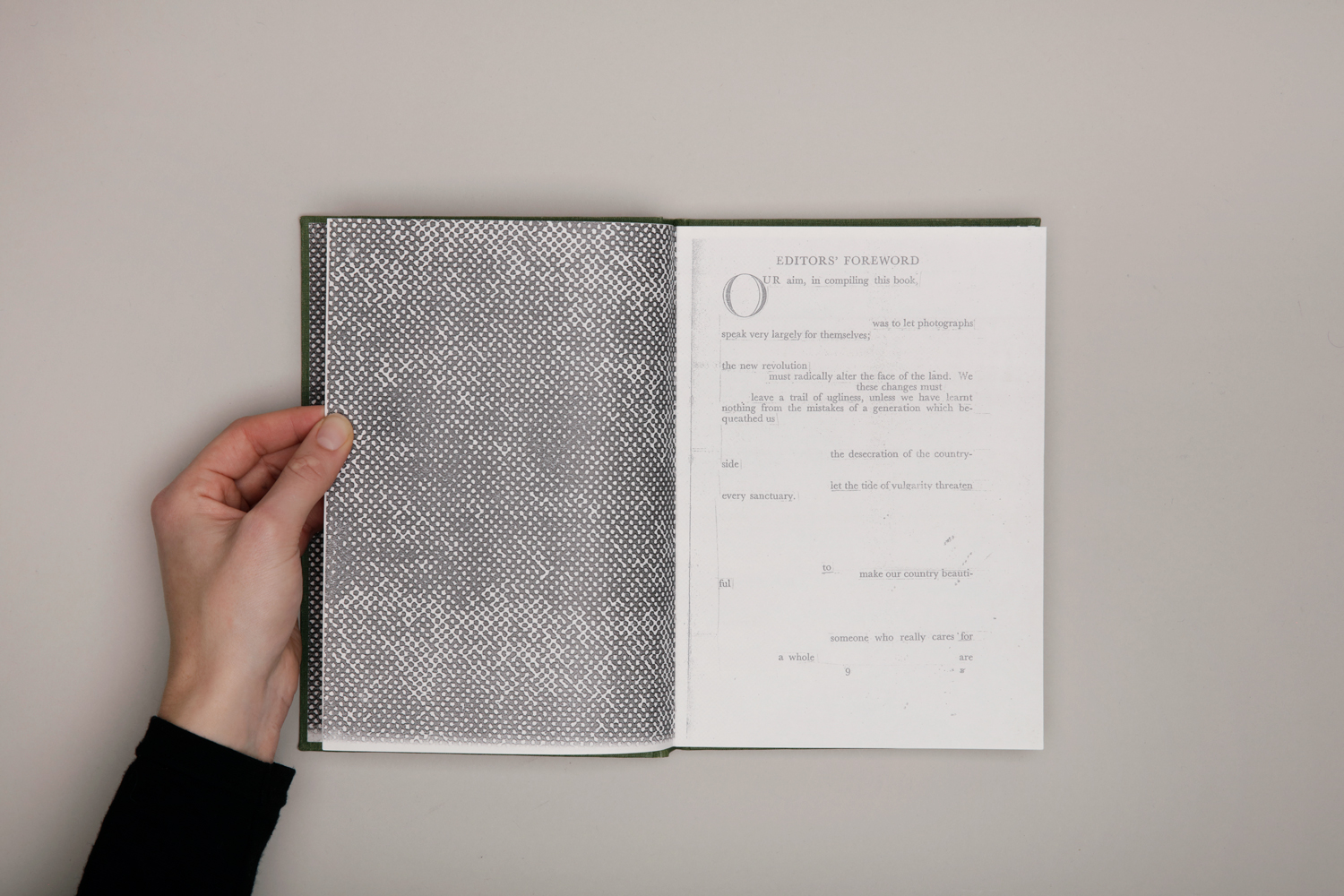 Using The Face of The Land as a site of interpretation the project fragments these images to reflect the commodification of nature while inviting a more reciprocal and immersive interaction with it. Using the form of traditionally bound books in a slipcase, mimicking The Face of the Land to critique how landscapes are idealized and reproduced, often through nostalgic, classically British frames. Placed on a pedestal, the books are both objects of reverence and a critique of the fragile, mediated narratives we impose on the land. The physical act of reading these books requires direct interaction, further dissolving boundaries. However, the pages are photocopied, making them fragile and prone to smudging and fading with touch, emphasizing the corrosive effects of reproduction due to human interventions.