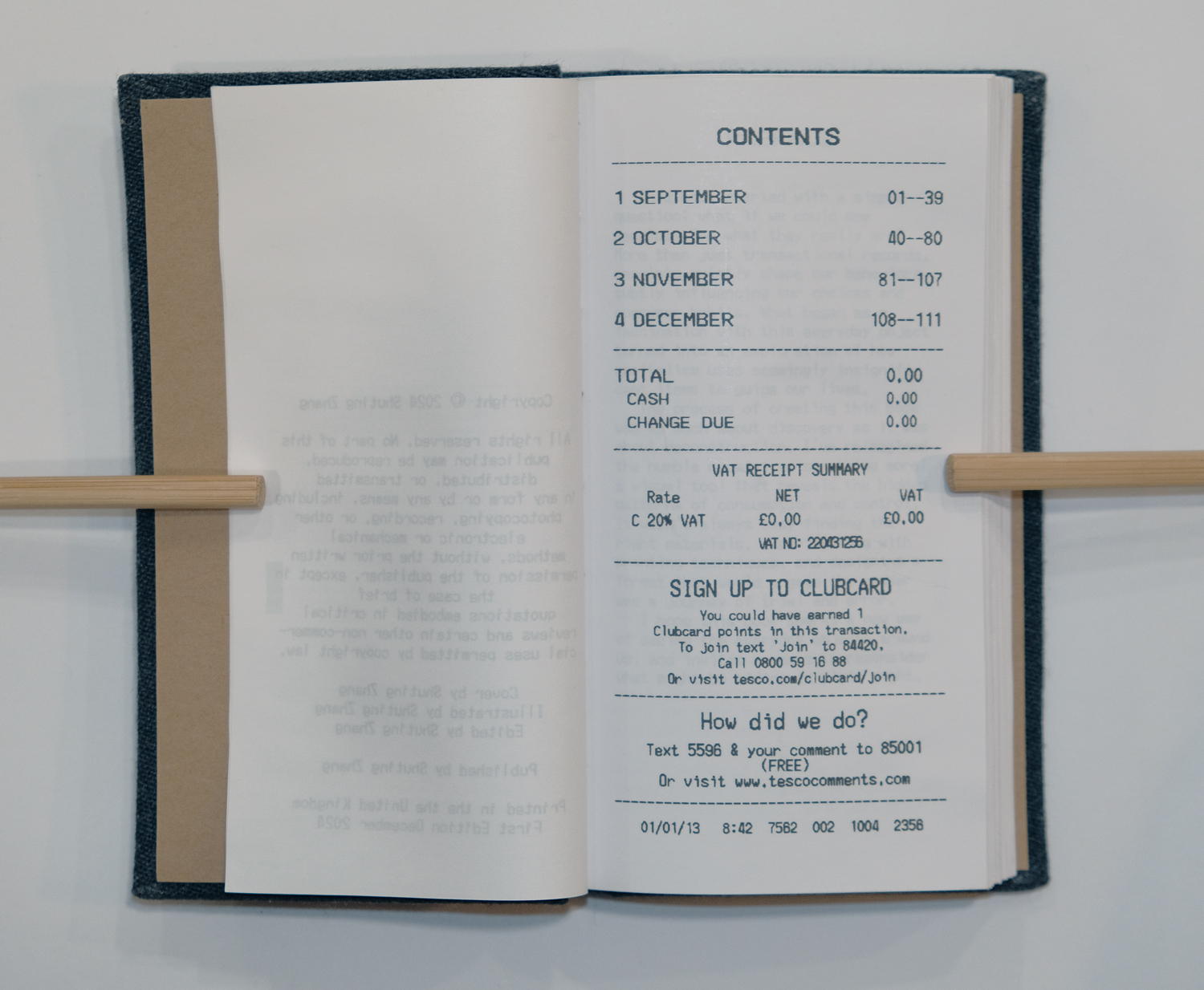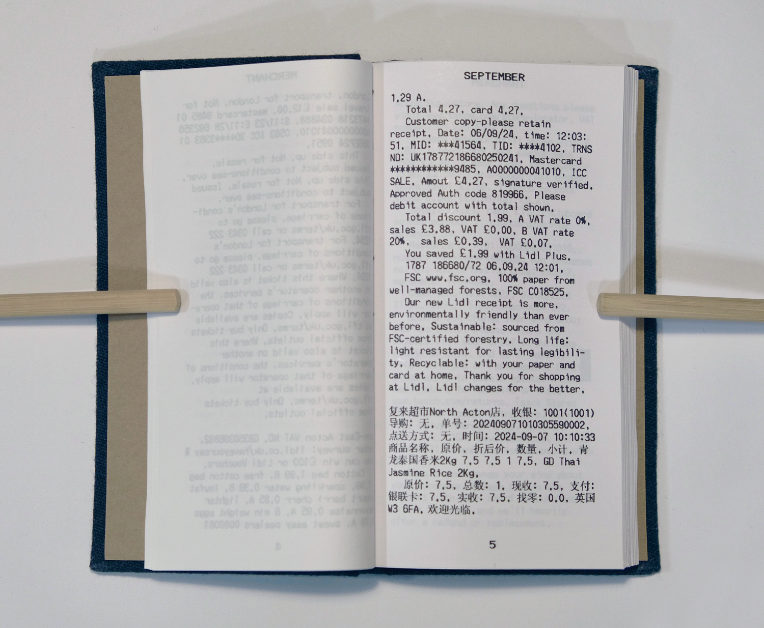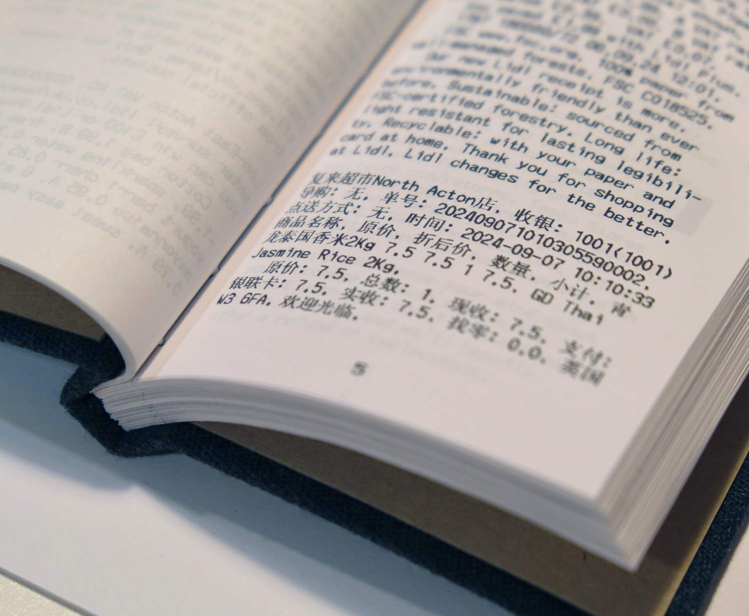By recontextualising receipts into a carefully crafted book, Merchant transforms the transient into the enduring, forcing a re-engagement with the medium itself. This project critiques the invisible forces embedded in everyday life, prompting reflection on how even the most mundane objects mediate relationships between individuals and broader systems of consumption and value.