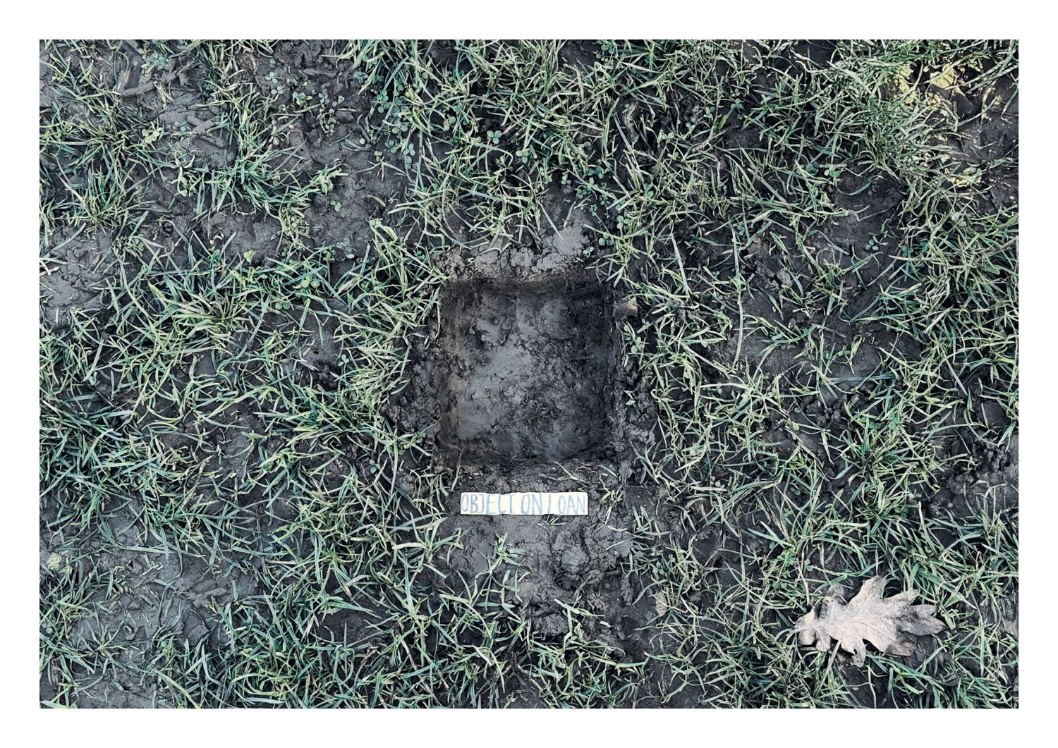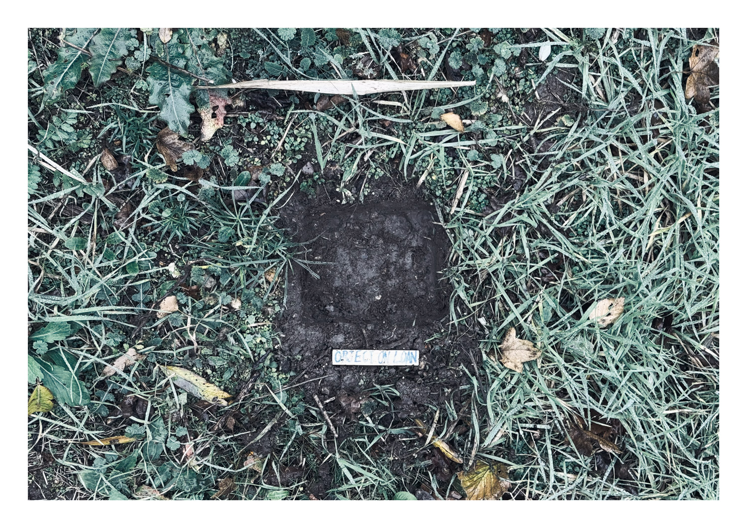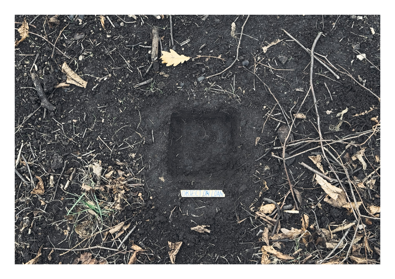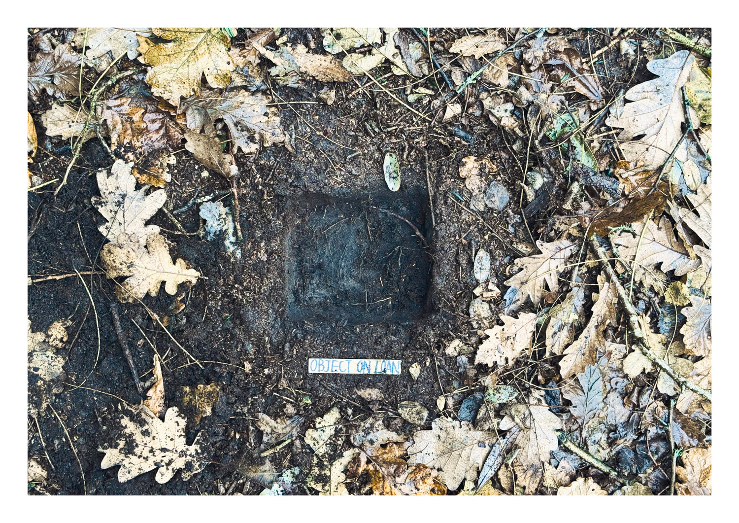 The act of digging away the soil means a ‘lack’, and presenting it as a photographic work transforms this lack into a ‘presence’. The digging action, the absent objects, and the label ‘object on loan’ provide a framework for a story, which may symbolise a certain loss of existence, such as the loss of culture, history, land ownership or natural resources, or other things that are outside the stripped images.