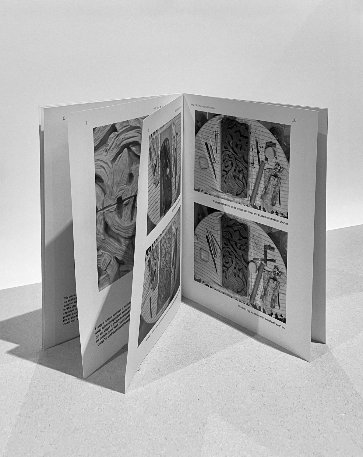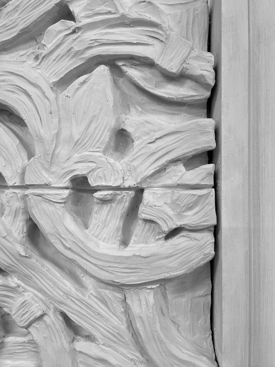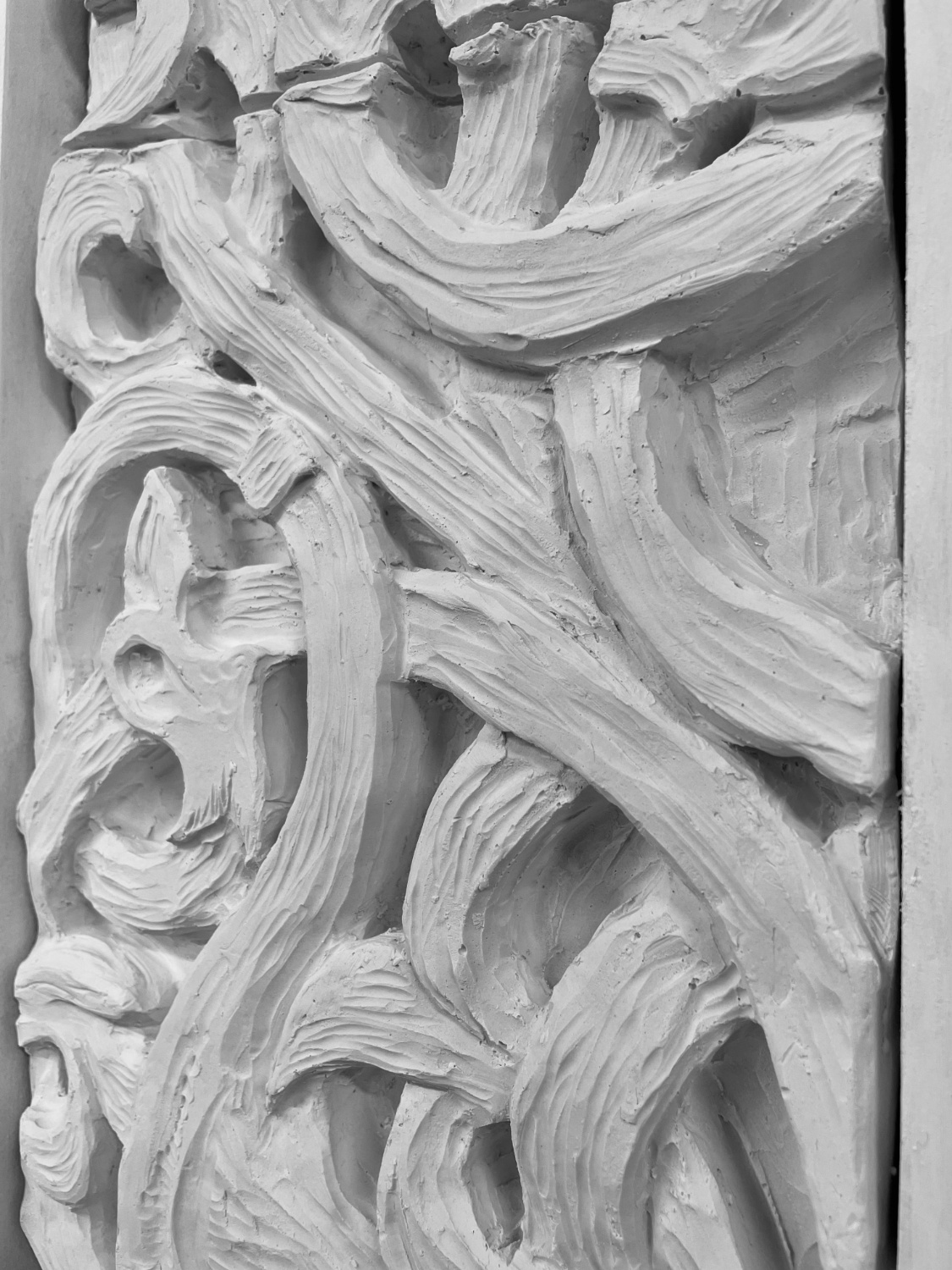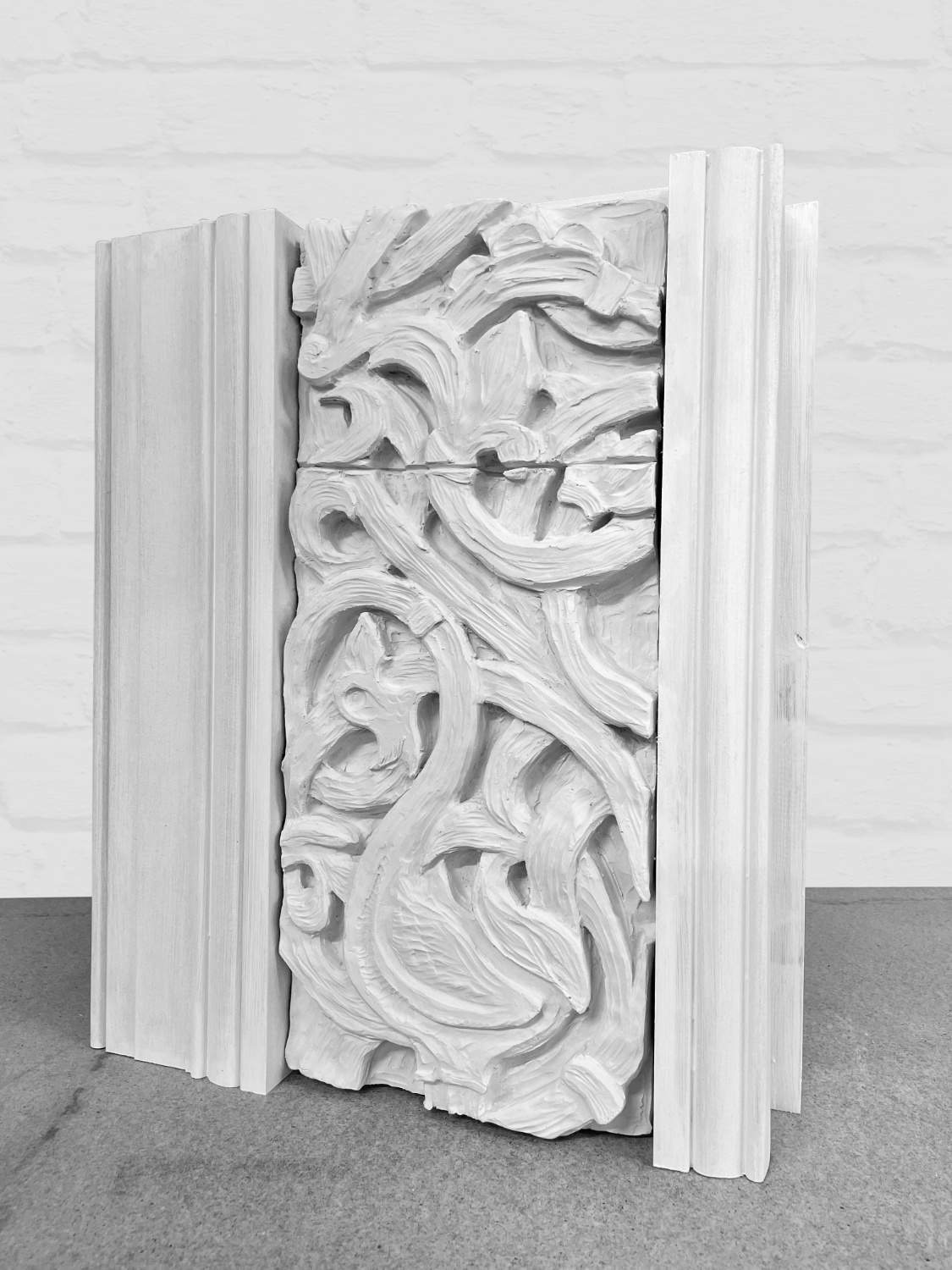 An object born of intention to showcase the artistry of ancient Pagan woodcarvers. Its inspiration lies in the intricate beauty of a casted Norwegian doorway, housed within the Cast Courts of the Victoria and Albert Museum. These storied carvings, rich with history, are reimagined in the hands of clay, then transfigured into the ghostly permanence of plaster. Pseudo Craftsman seeks to honour the delicate ornamentation of cultural heritage, evoking the soul of timber’s raw essence within the purity of its new form. Here, the spirit of a forgotten craft dances with a shadowed imitation — an homage both reverent and unreal — preserving the echoes of tradition in a new form.
