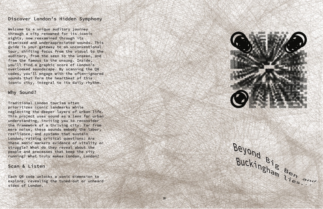 This project critiques and reimagines conventional approaches to London tourism through an innovative, sound-focused brochure that foregrounds the city’s often hidden yet essential auditory landscape. Departing from traditional tourism guides that emphasise iconic landmarks and popular attractions, this brochure functions as a graphic score, mapping the city’s overlooked sonic environments. Central to the design is a deconstructed QR code that serves as both a visual representation and a gateway to London’s auditory world. The QR code unfurls into an intricate composition of musical notations and scannable elements, mirroring the ephemeral nature of sound as it drifts through urban spaces. By scanning these codes, users embark on an auditory exploration of London’s fundamental yet under-appreciated sounds—garbage trucks, street cleaners, metro toll beeps, restaurant kitchen hums, museum vacuums, roadworks, and public transport—sounds often dismissed as mere nuisances but crucial to the city’s daily operations and vibrancy.