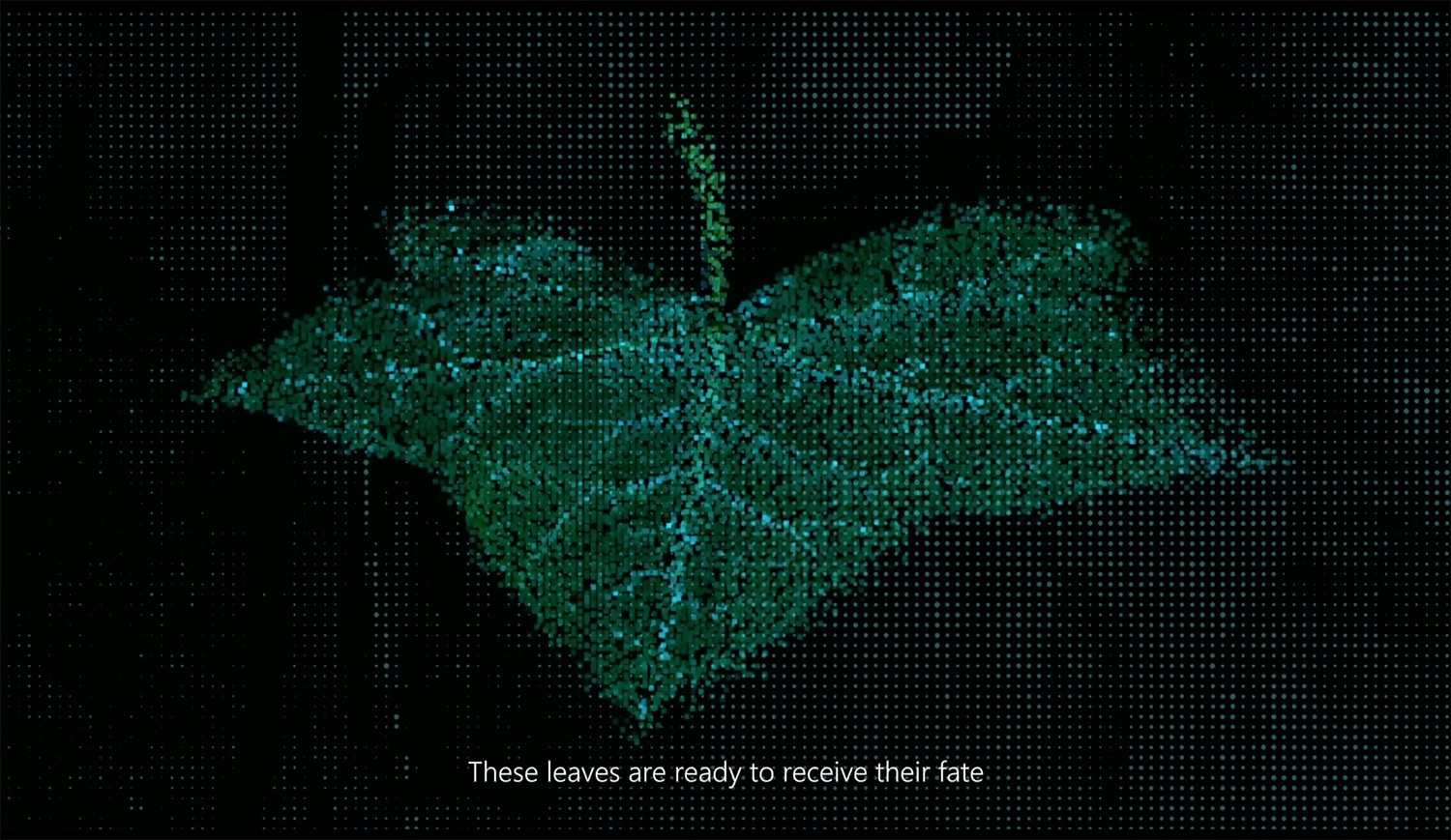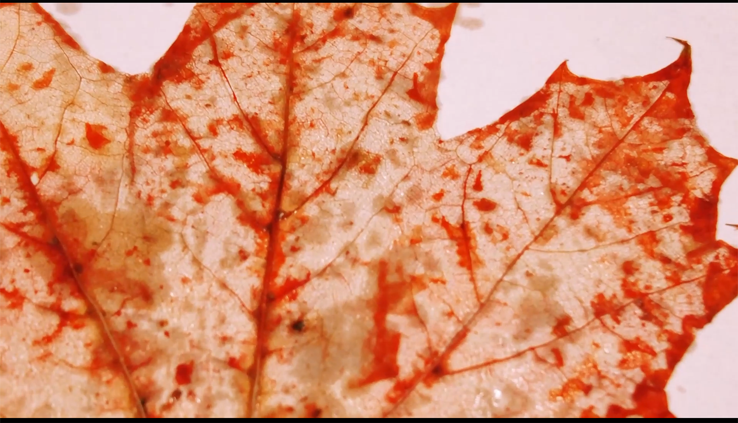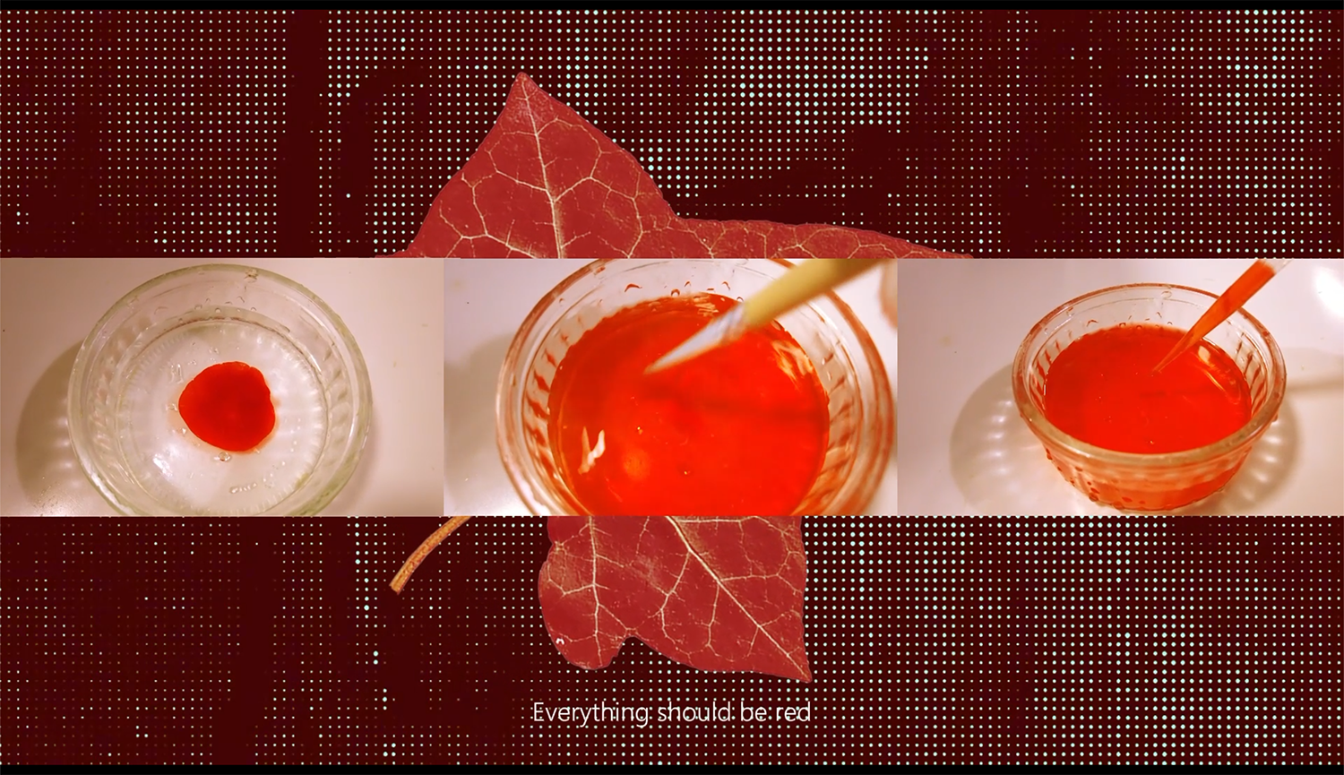 Scarlet Dystopia is a video work set in a "laboratory of the future," showcasing human interference in leaf growth by turning all the world's leaves red.