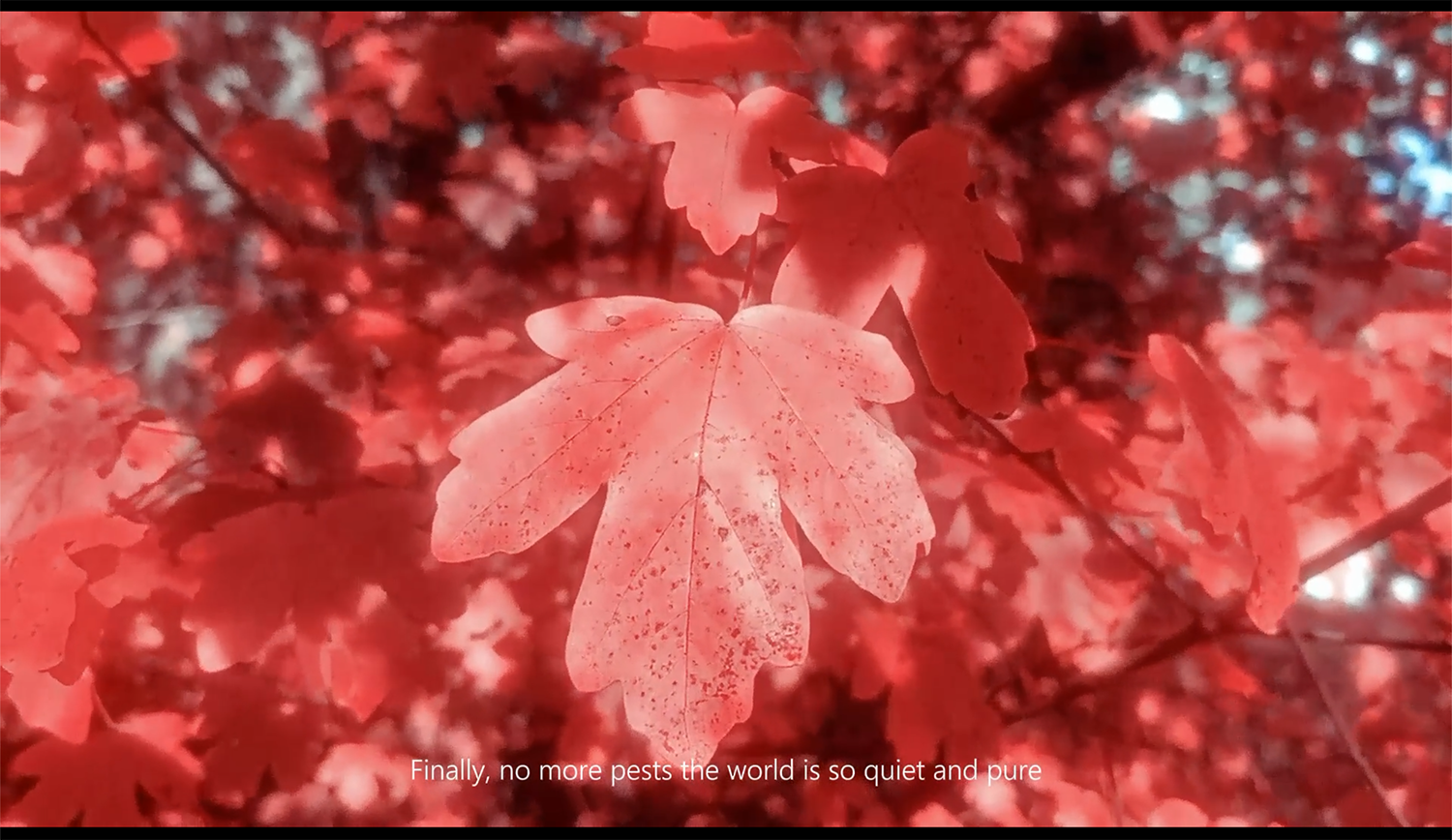 Based on this phenomenon, I envisioned the far-reaching effects on the ecosystem if humans changed the leaf color of all trees to big red. The ecological balance could be disrupted without insects, which play a key role in plant growth, pollination, and decomposition. At the same time, the leaf color change would also affect the foraging behavior of birds and other animals, which in turn would alter the food chain. This provokes us to consider whether humans have the right to intervene in nature and its possible ecological consequences, showing the material entanglements between humans and non-humans involving science, ethics, and environmental protection issues.