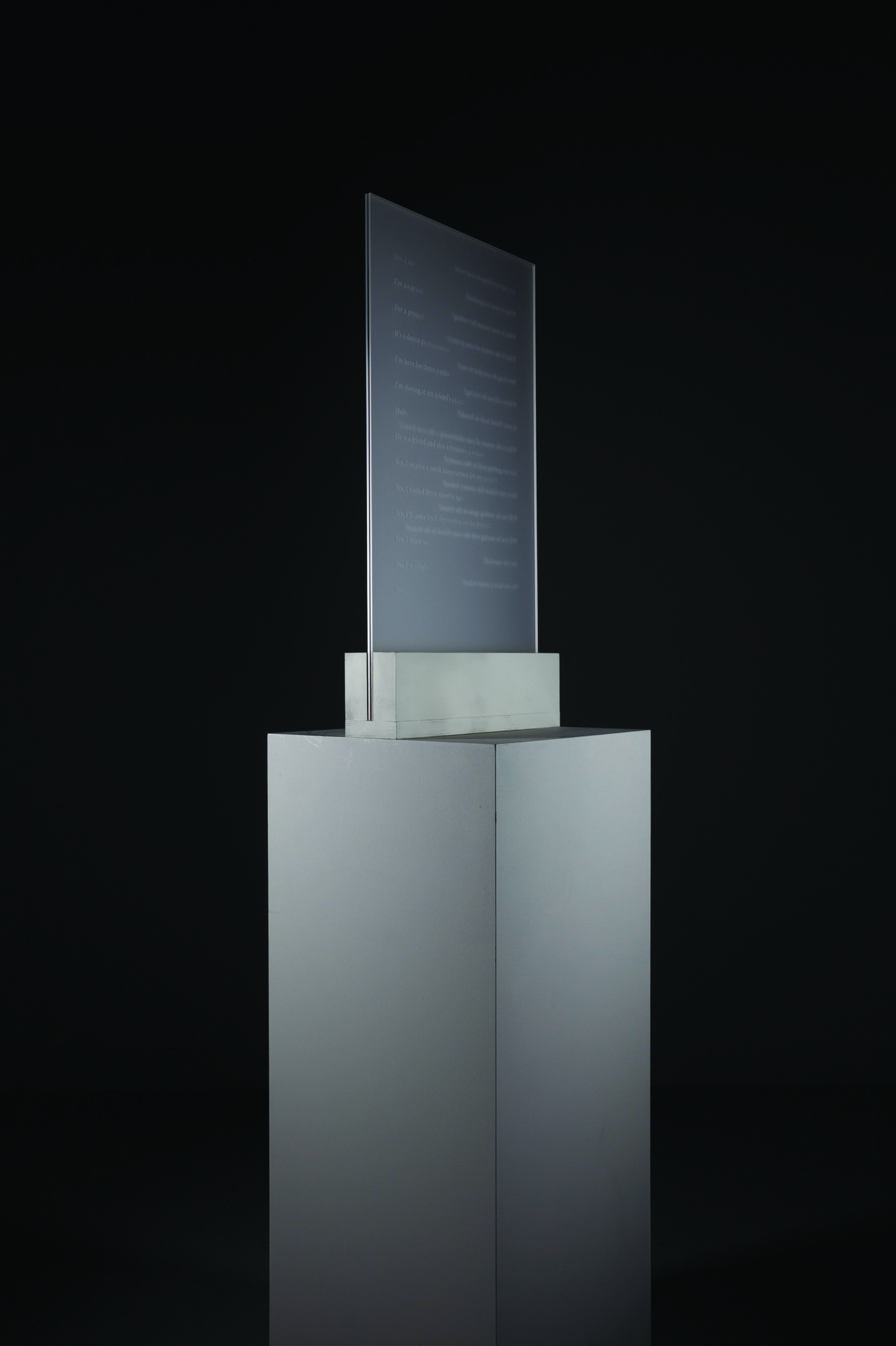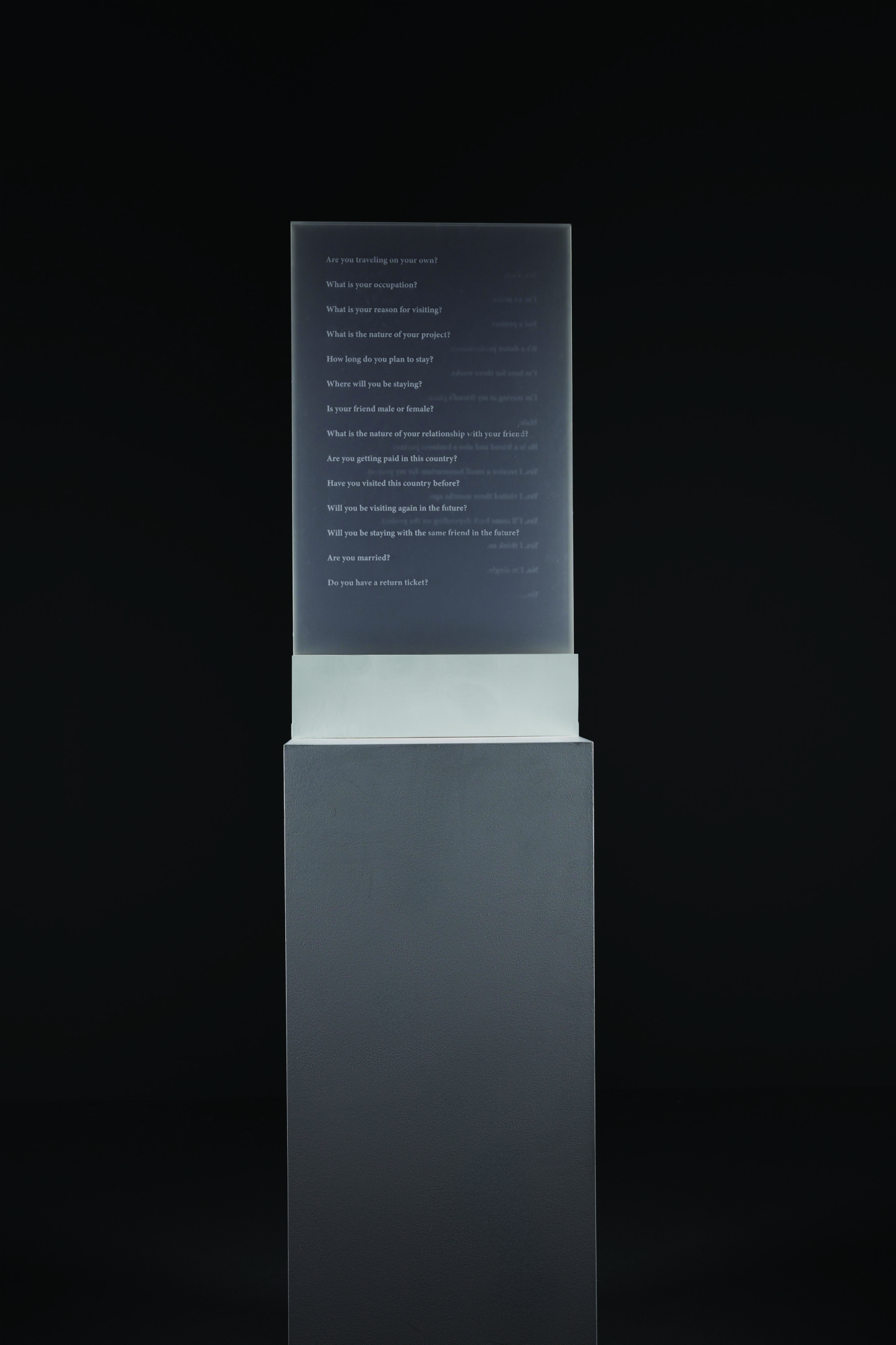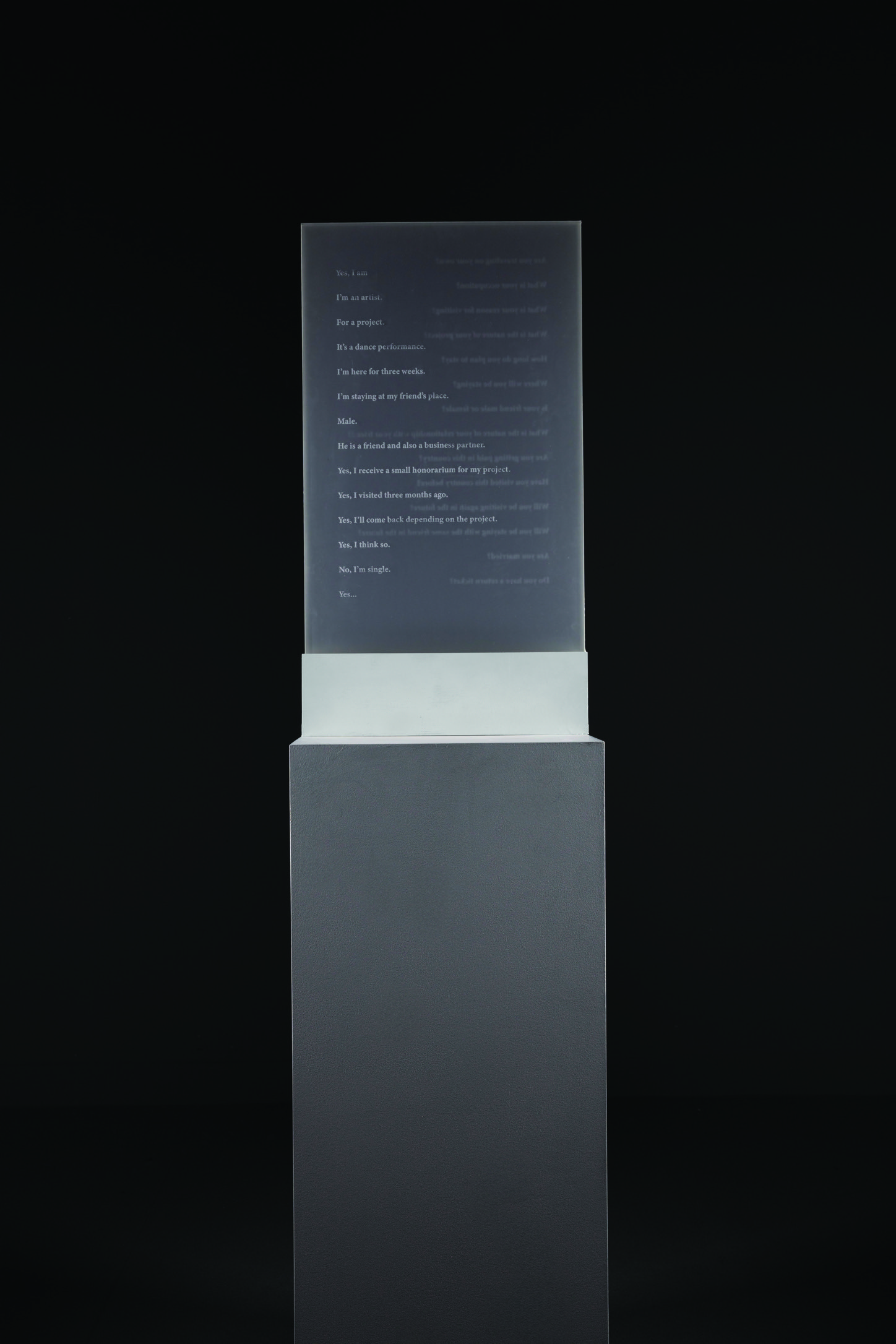 The verbal exchange between the person travelling and the immigration officer in the incident described above has been transferred onto a semi-transparent panel that evokes the size of an immigration booth at an airport. One side of the panel is dedicated to the words spoken by the traveller, and the other to those spoken by the officer. When viewed from one side, only the text of one character is visible, while the other remains obscured by the material’s opacity.