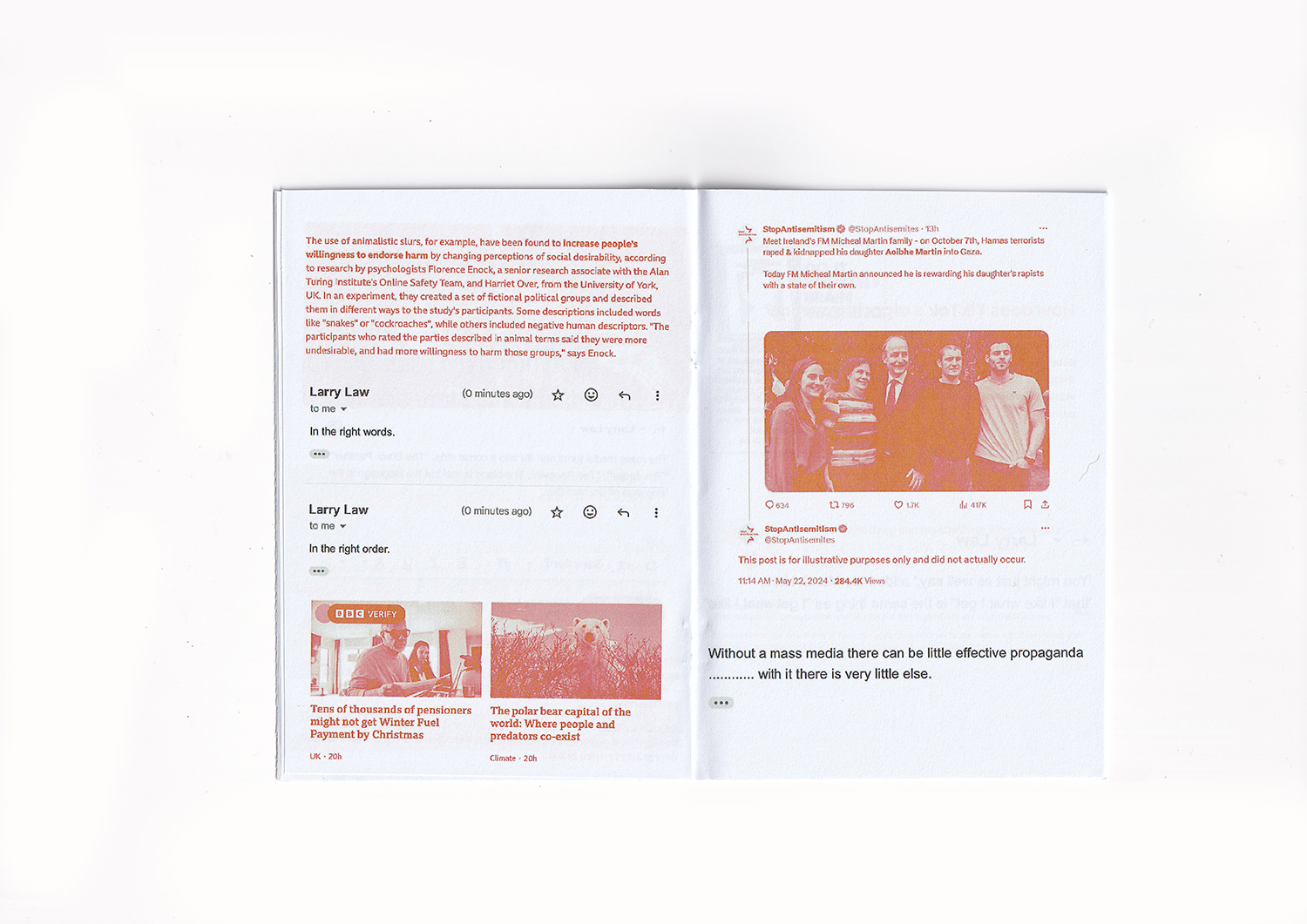 Spectacular Subversions sets out to republish the original Spectacular Times pocketbooks with new interventions made in the text and imagery. To begin with, the first three issues are to be remade and contrasted with republished and unedited copies of all 14 issues of the series. This is to demonstrate the changes made in the new republications through juxtaposition and to set out a goal for the future of the project where all issues are to be remade in this format. The republished issues will be moved from the original handwritten and xeroxed format to digital formatting, including translating Larry Lawâs original text into a Gmail exchange and quotes into Google Docs screenshots. All new insertions into the text are to be coloured orange in contrast to the original black and white format, with a large orange band running down the front of every republished issue. Finally, a new Issue 0 will be created, filling in the gaps in the seriesâ history and conclusion.