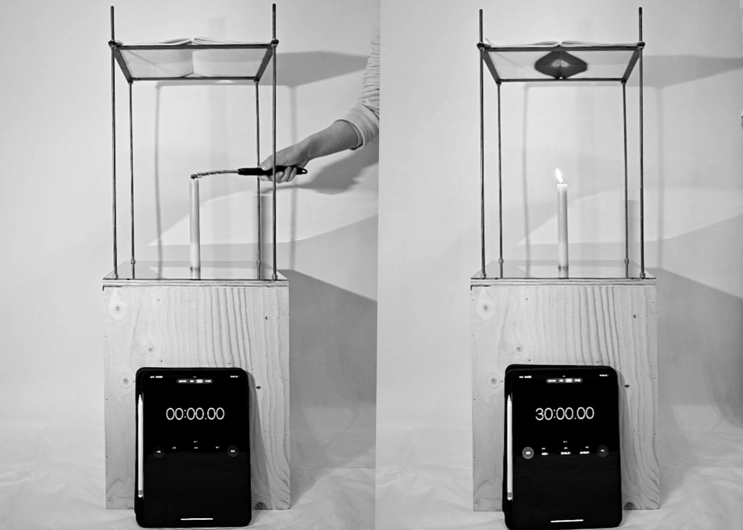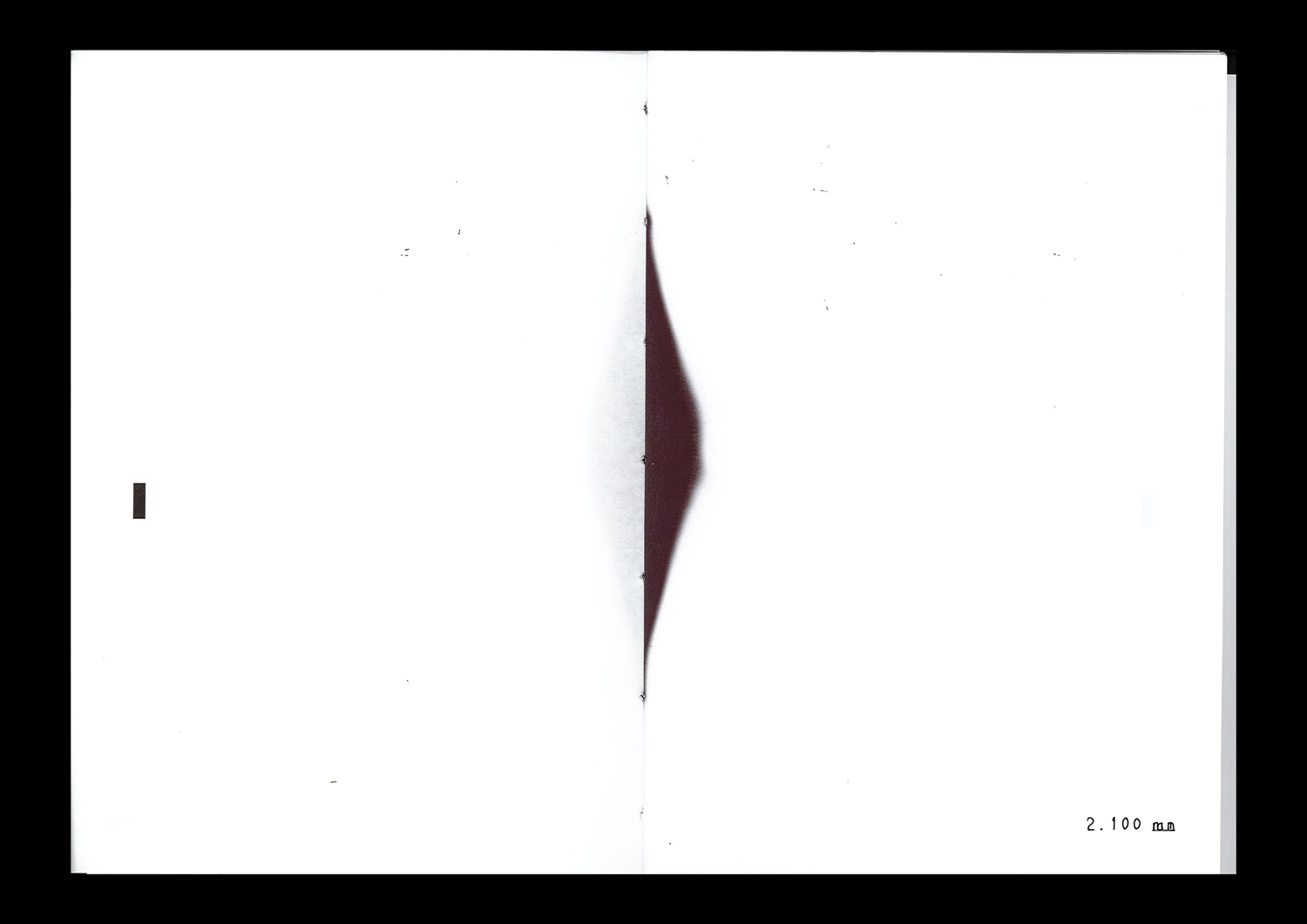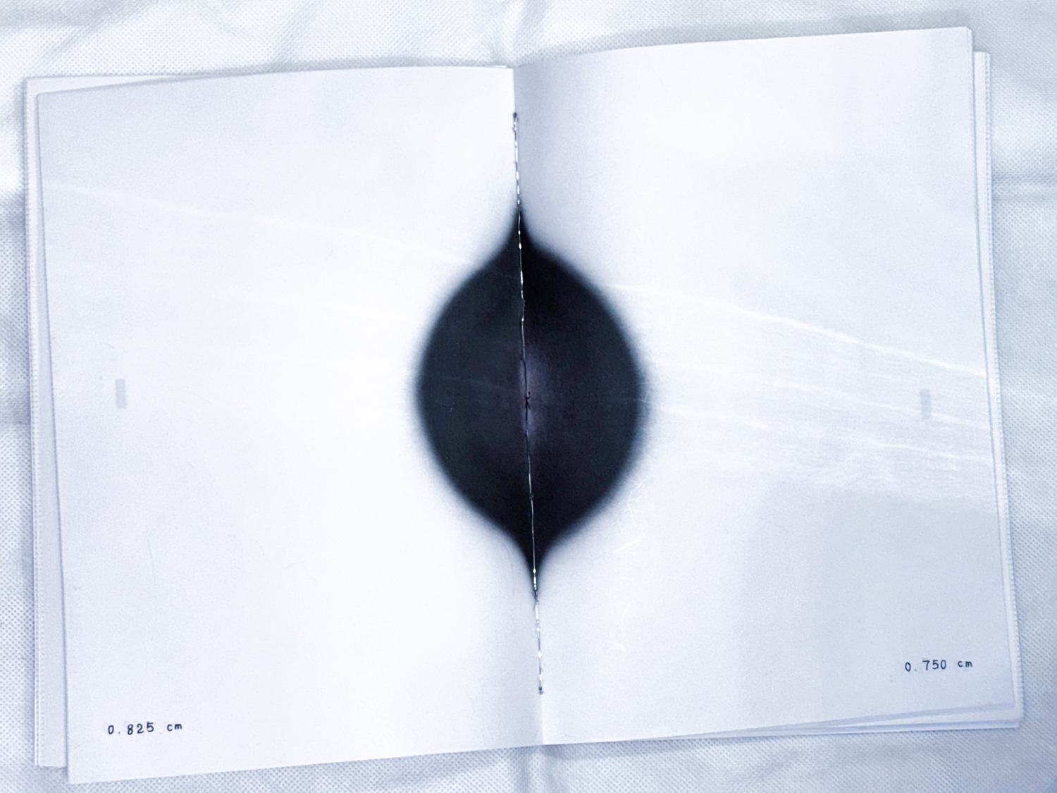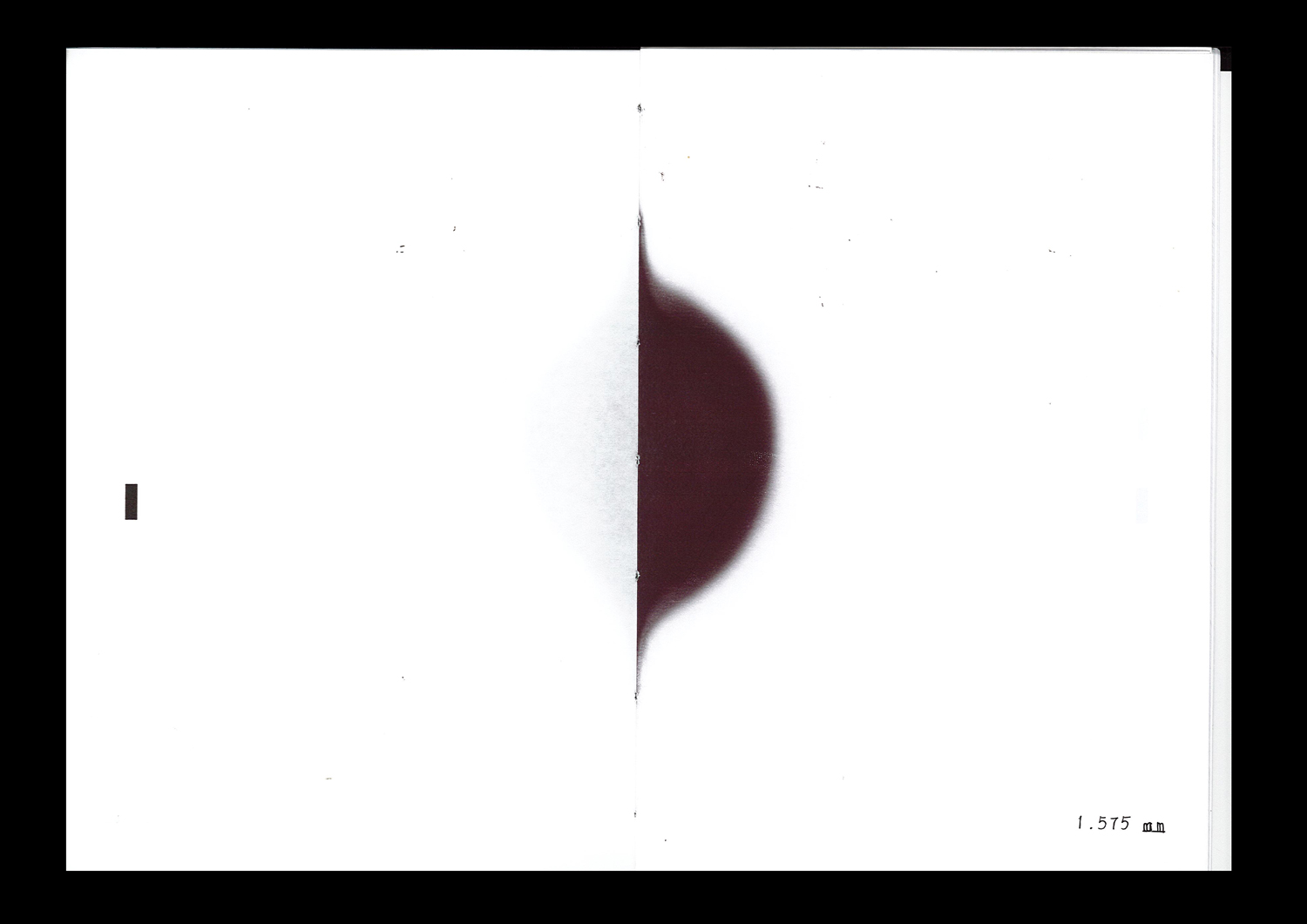 The object's design engages with the material properties of thermal paper and how it is commonly used for the rapid imaging of receipts. This process explores the relationship between the degree of discolouration of surface, heating time, heating area, and distance. Depending on the distance of each page from the heat source, which is determined by the books thickness, the page gradually turns black. When the candle has fully burnt, the image changes from lighter to darker and back again. Like a storybook with a narrative plot, this book is composed of a candle flame with a controlled, regular rhythm. Thus, Speed = Distance/Time visualizes time and speed through increasing, burning distance.