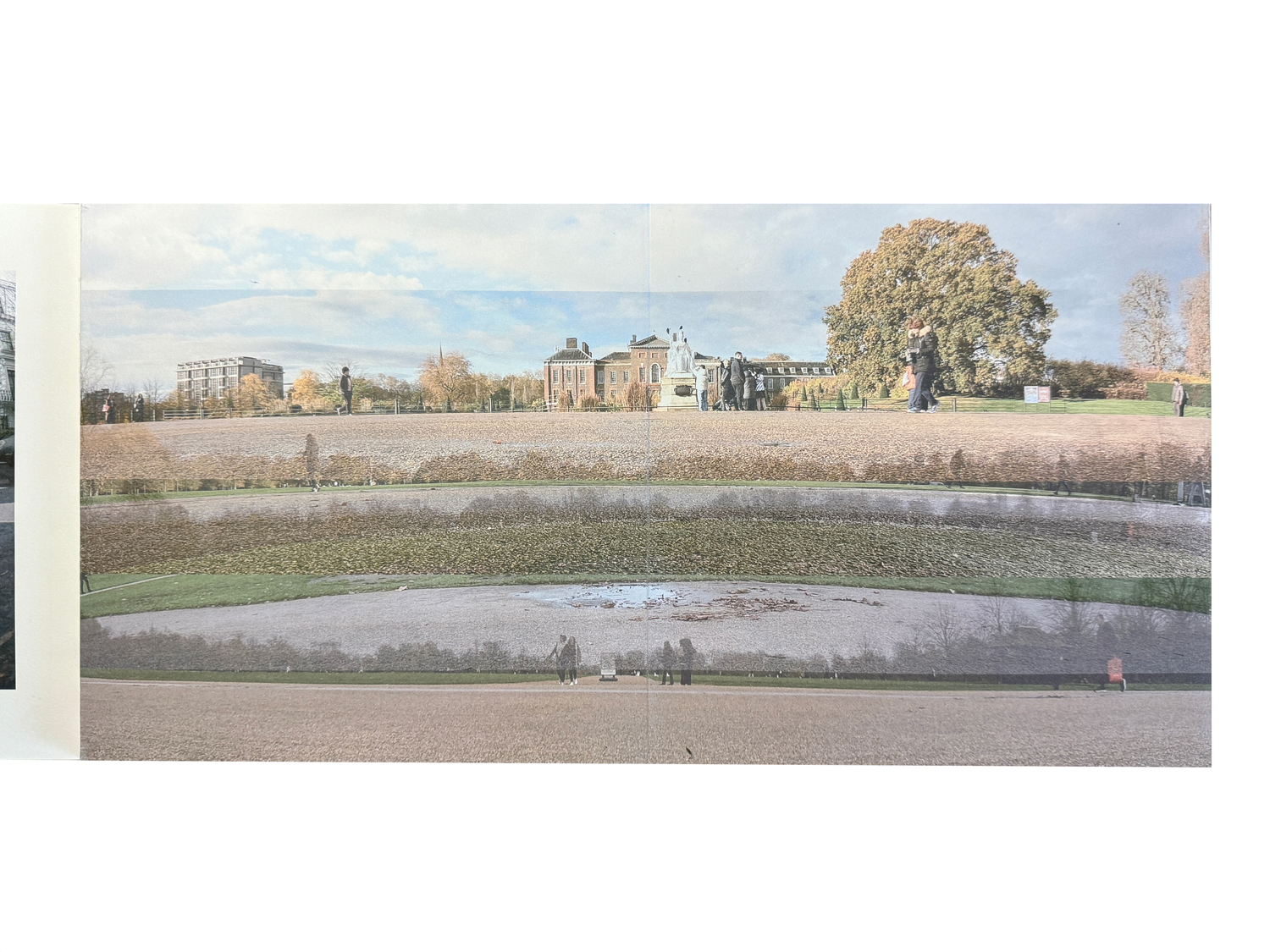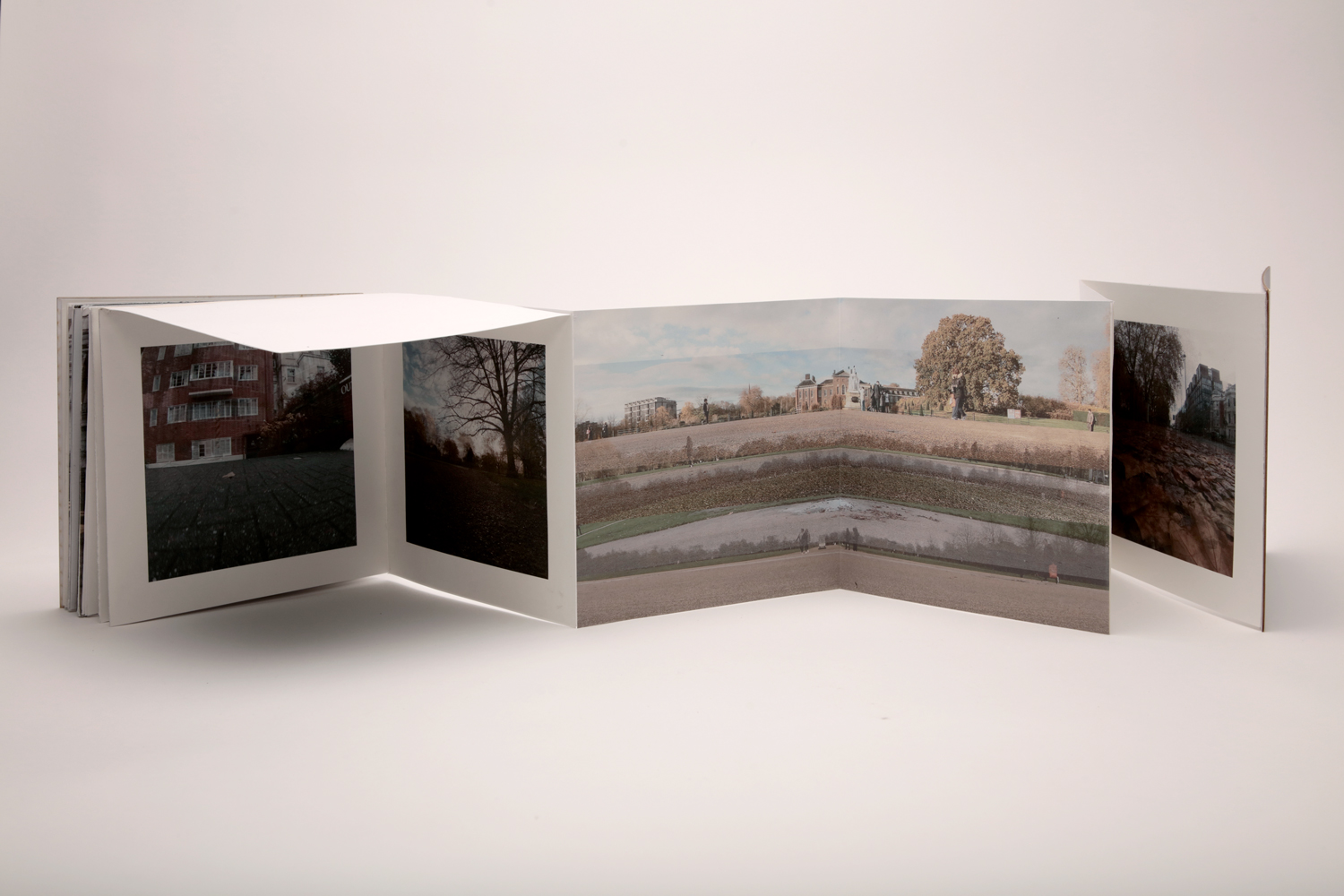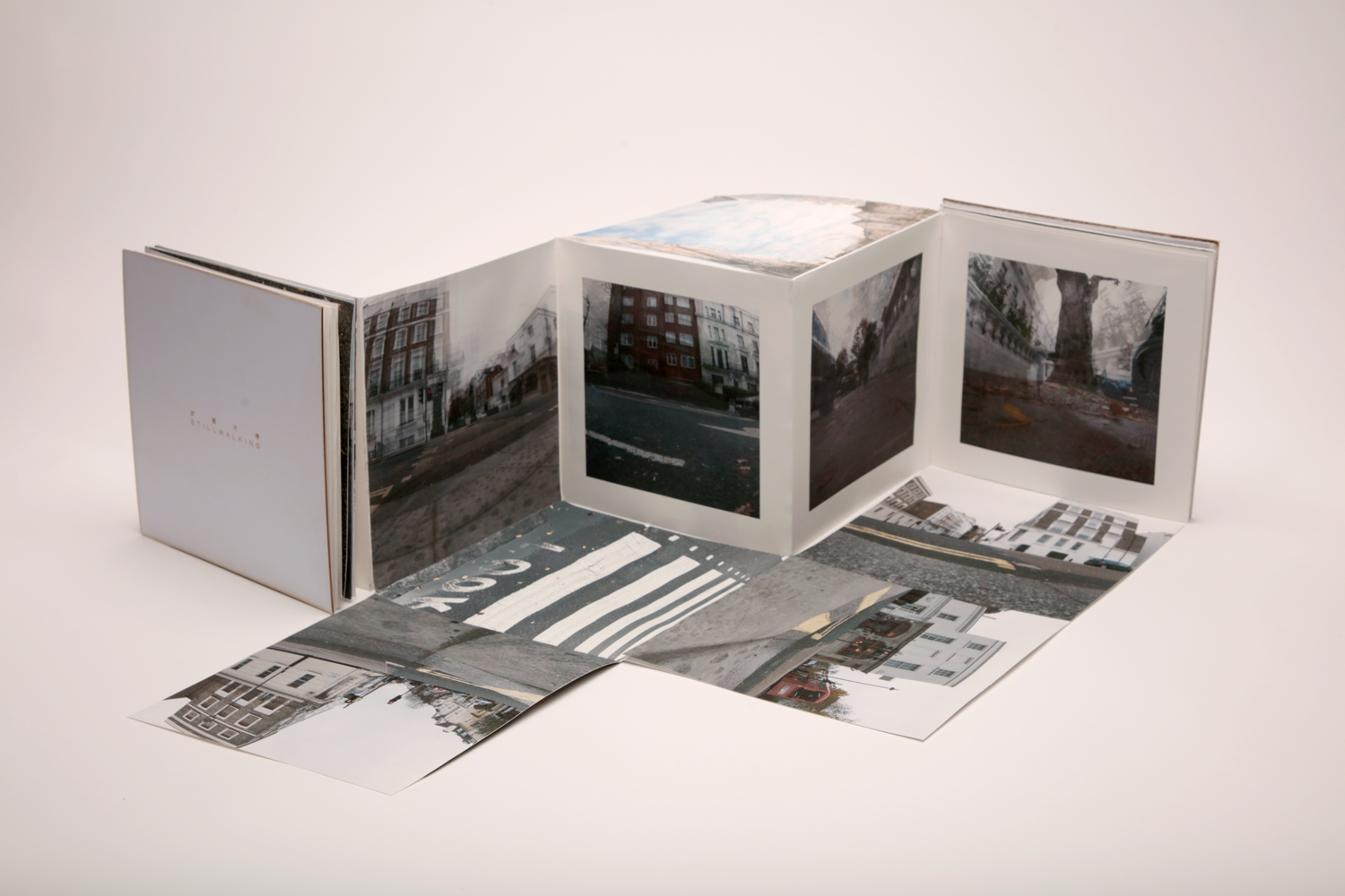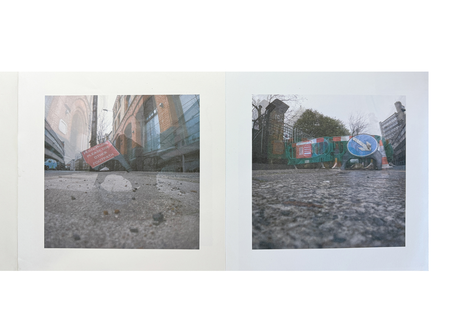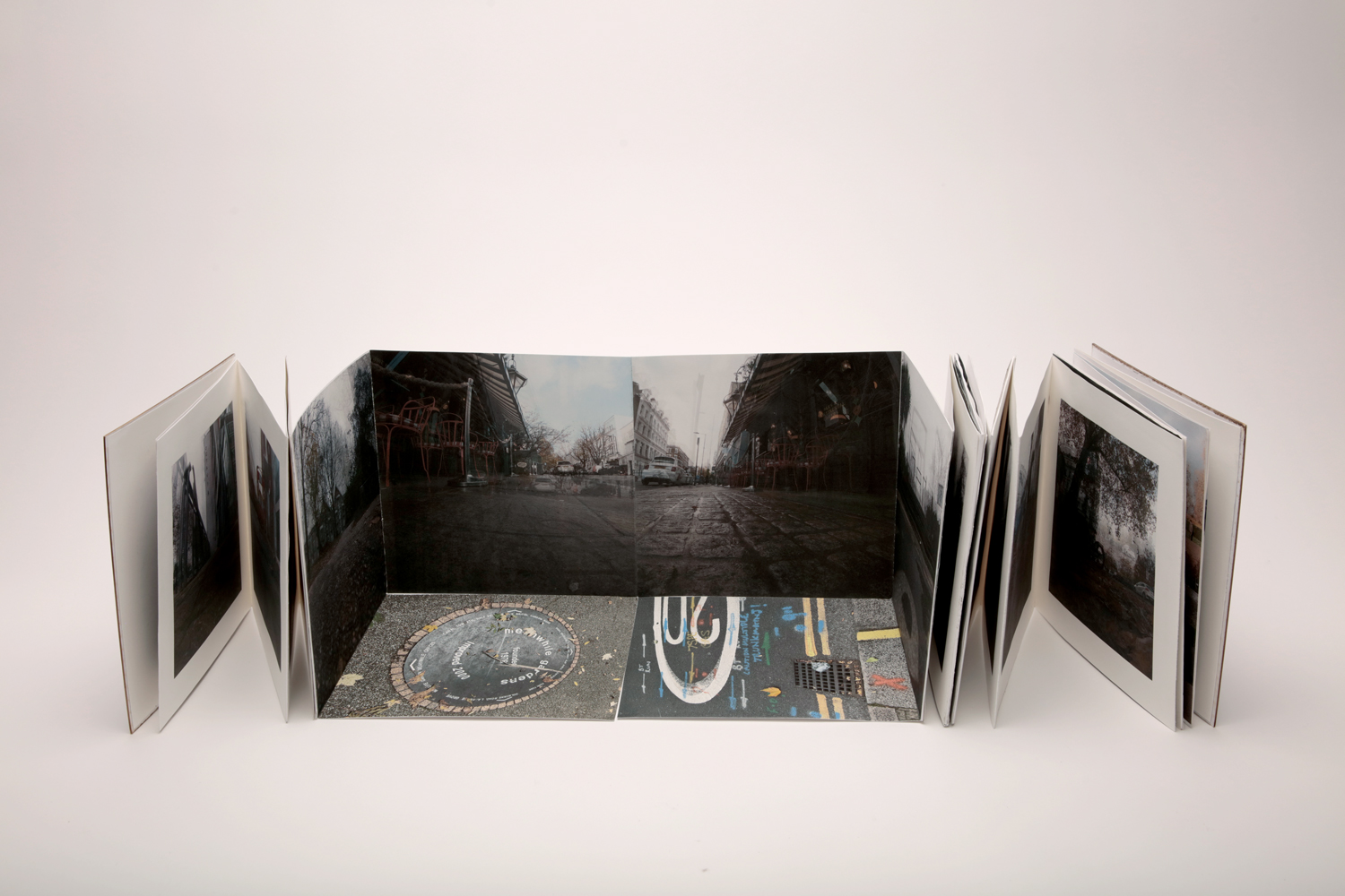 The form of the book captures the unfolding of this journey, sculpting a map which extends and unfolds like a road at one's feet. These fold outs construct the road from the perspective of my feet, such as looking down and up to capture junctures and crossings which my feet experienced.