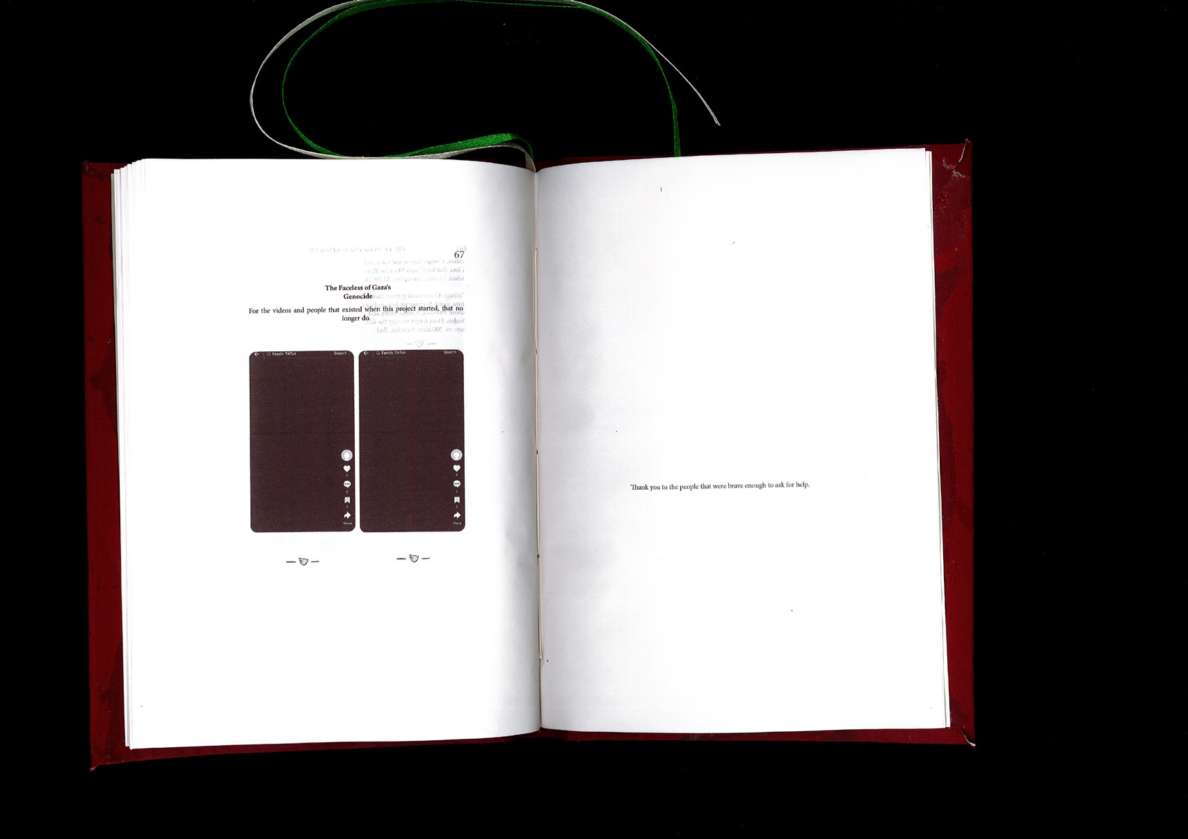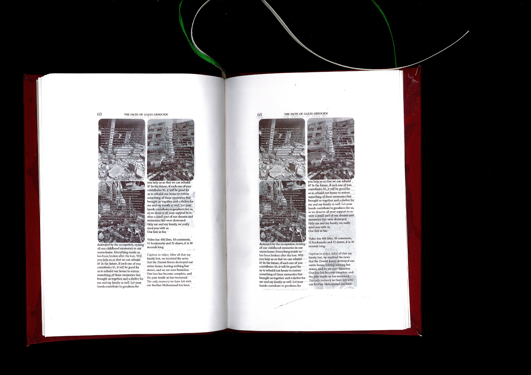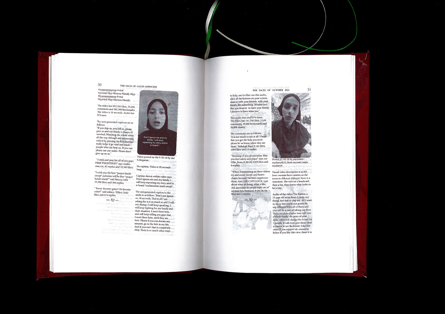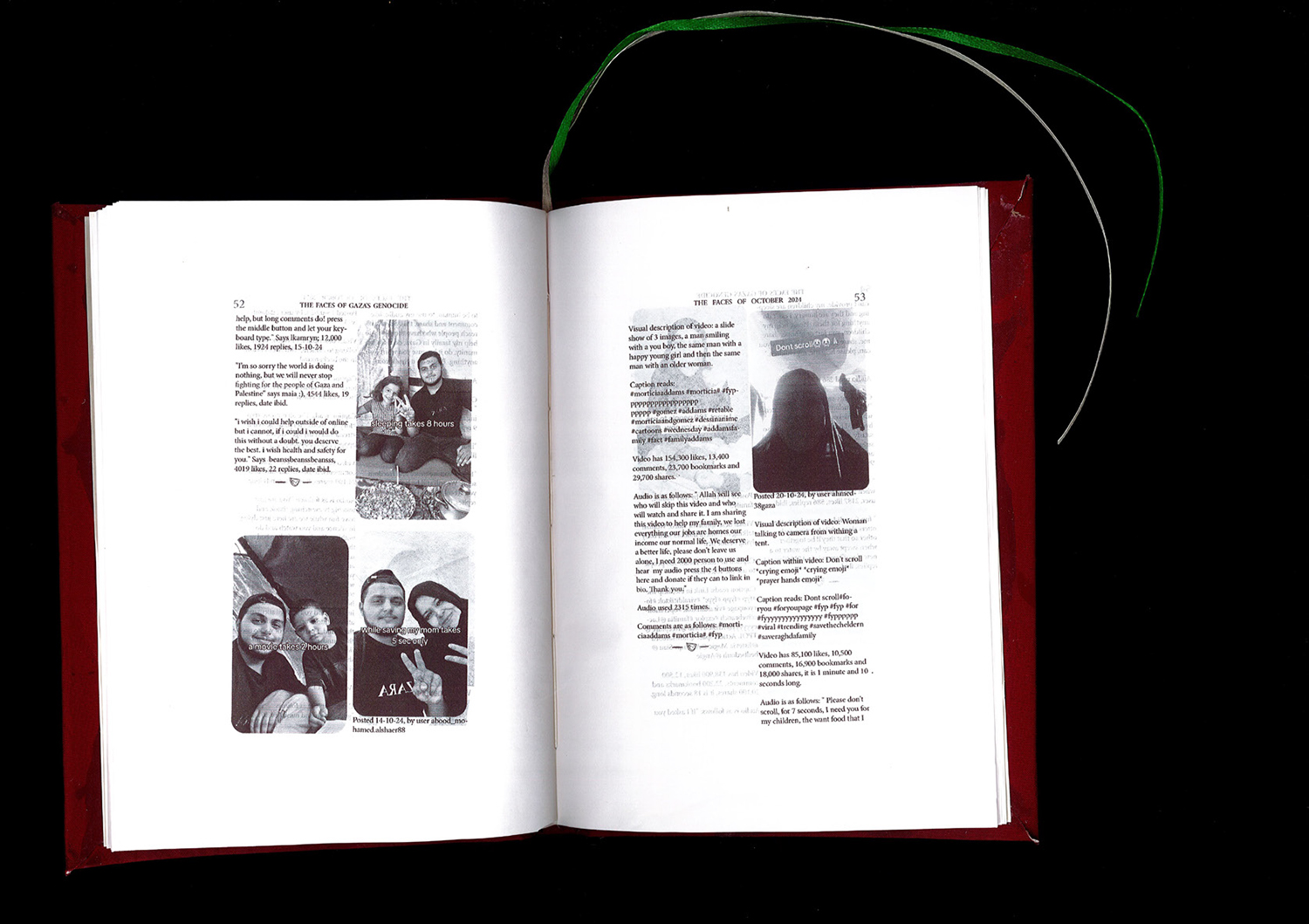 This project translates these videos into printed format, creating a physical archive that records the voices of Palestinians over the past 13 months. By documenting the content of each video — what was asked for, how it was received, and how it interacted with the wider TikTok community — the project captures a raw, real-time record of personal pleas and stories amid one of the world’s most pressing humanitarian crises. The project also addresses the impermanence of social media: videos are often deleted, suppressed, or overlooked. Therefore, this archive is a permanent record, safeguarding these voices for future generations.
