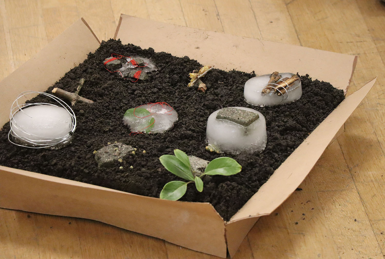 Ice acts as a medium to seal natural materials, such as twigs and leaves, from artificial debris, such as metals, creating interactions between organic and artificial elements in a dynamic ecosystem. The material layer invites the viewer to witness the passage of time interacting with the state of matter through ice's gradual and unpredictable melting. The process unfolds on the soil, choosing to evoke the cascading history and nature of the site, St. George's Garden, where human history and natural growth intersect. By recreating and abstracting this coexistence, it is hoped to trigger symbolic conversations about the balance, tension, and adaptation between organic and artificial environments in dynamic ecosystems.