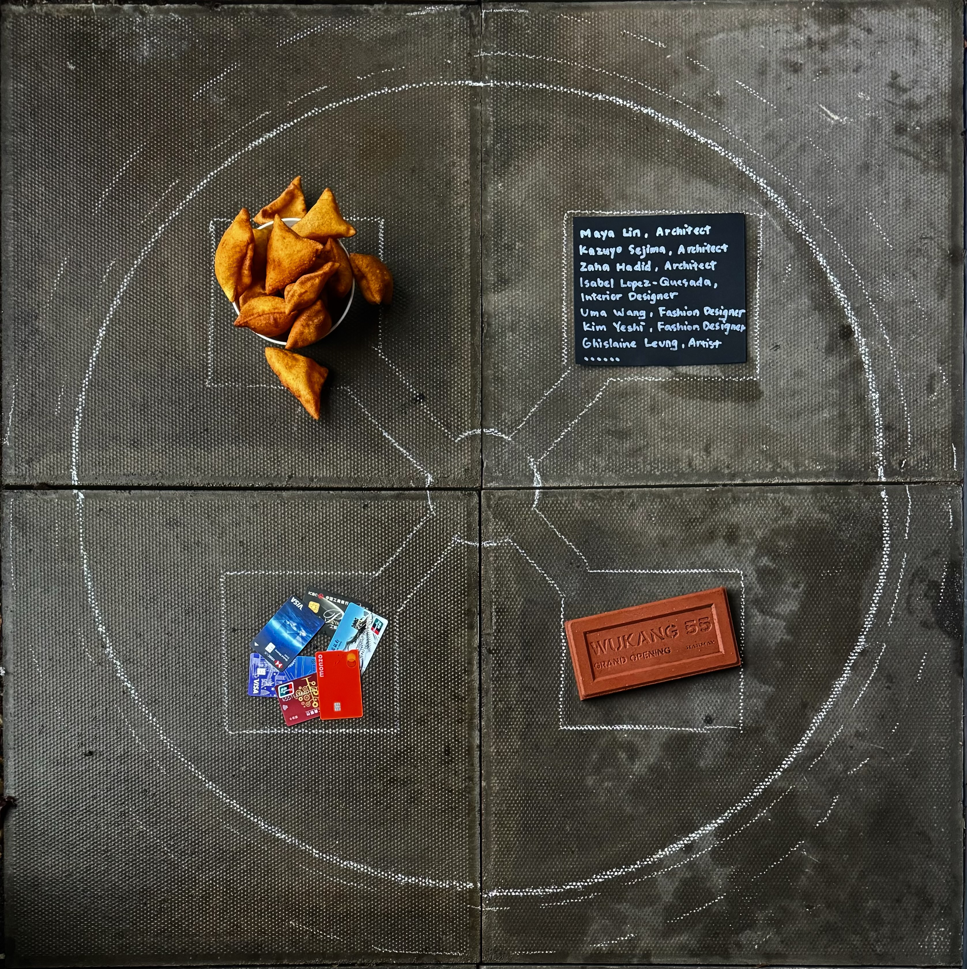 I incorporated ready-made items like bank cards, a list of female creators, my mom’s cookies, and a brick from my first architecture project into my mandala drawings, which reflect order, balance, and integrity.