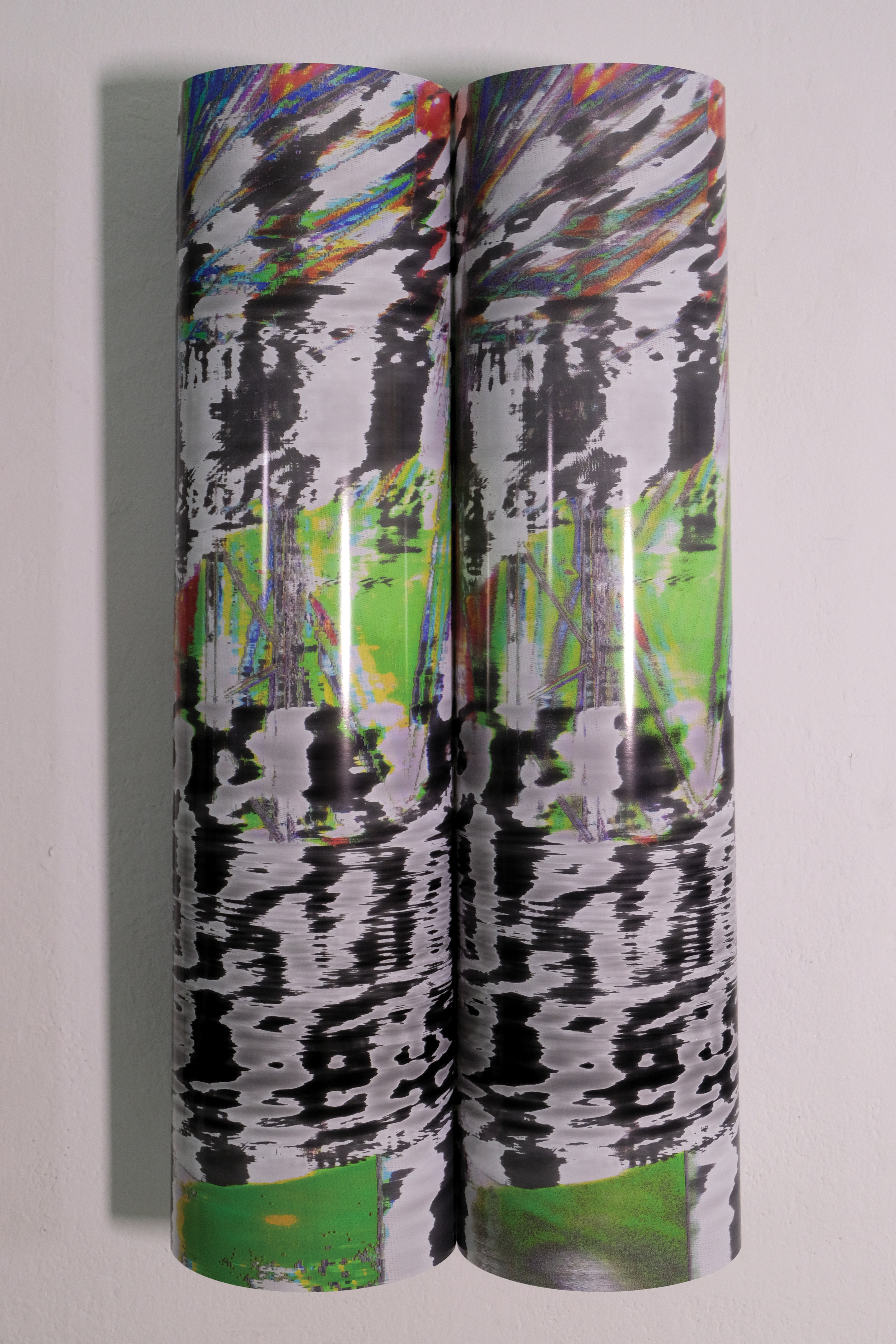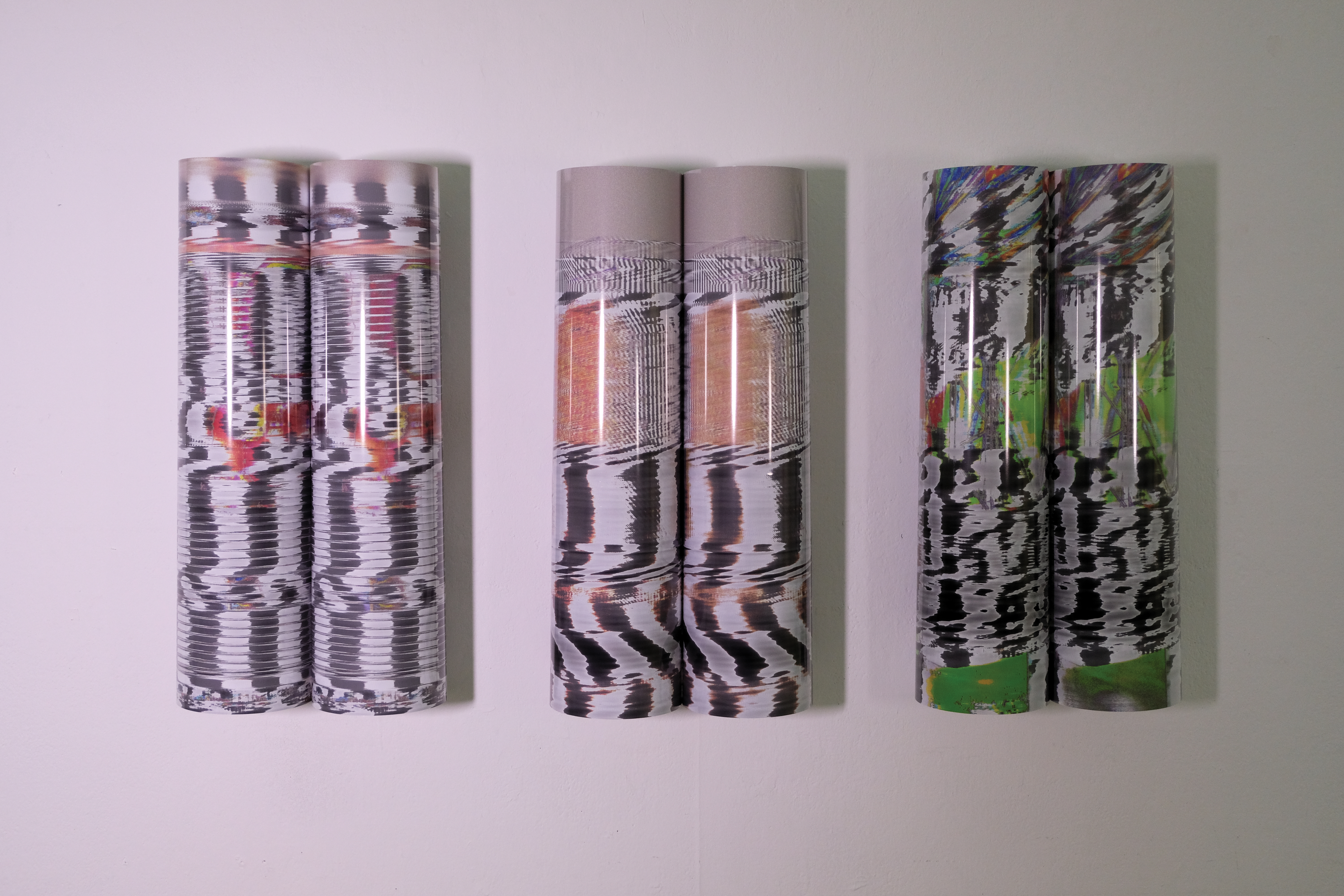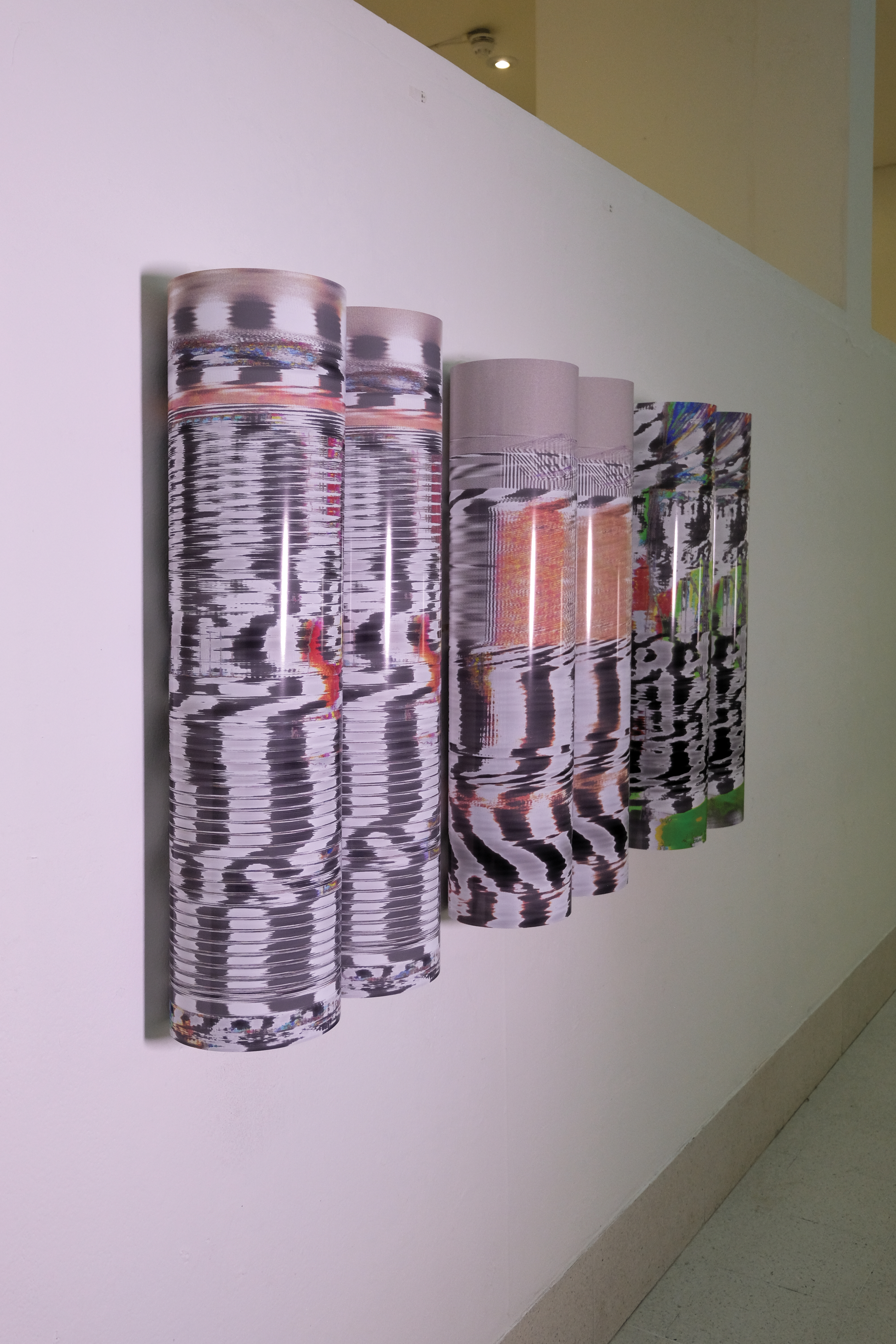 The project is executed through a series of six images printed on enhanced gloss paper in an A1 portrait format, arranged into pairs on the wall. each pair features a compressed and uncompressed version of the same photograph that has been passed through the Vocoder effect. The resulting images are glitched and stripped of narrative context with the only discernible differences being the exposed artefacts of JPEG compression. Consequently, the viewer is forced to critically examine the relationship between the images in each pair and how JPEG files lead to erasure through a form of simulacrum. This loss in visual data is further expressed through the physical curvature of the prints themselves, the images are never completely visible requiring the viewer to carefully peer around and examine details. The gloss paper, which is typically used in professional photography contexts, creates light distortions and reflections that further emphasise loss of visual information.