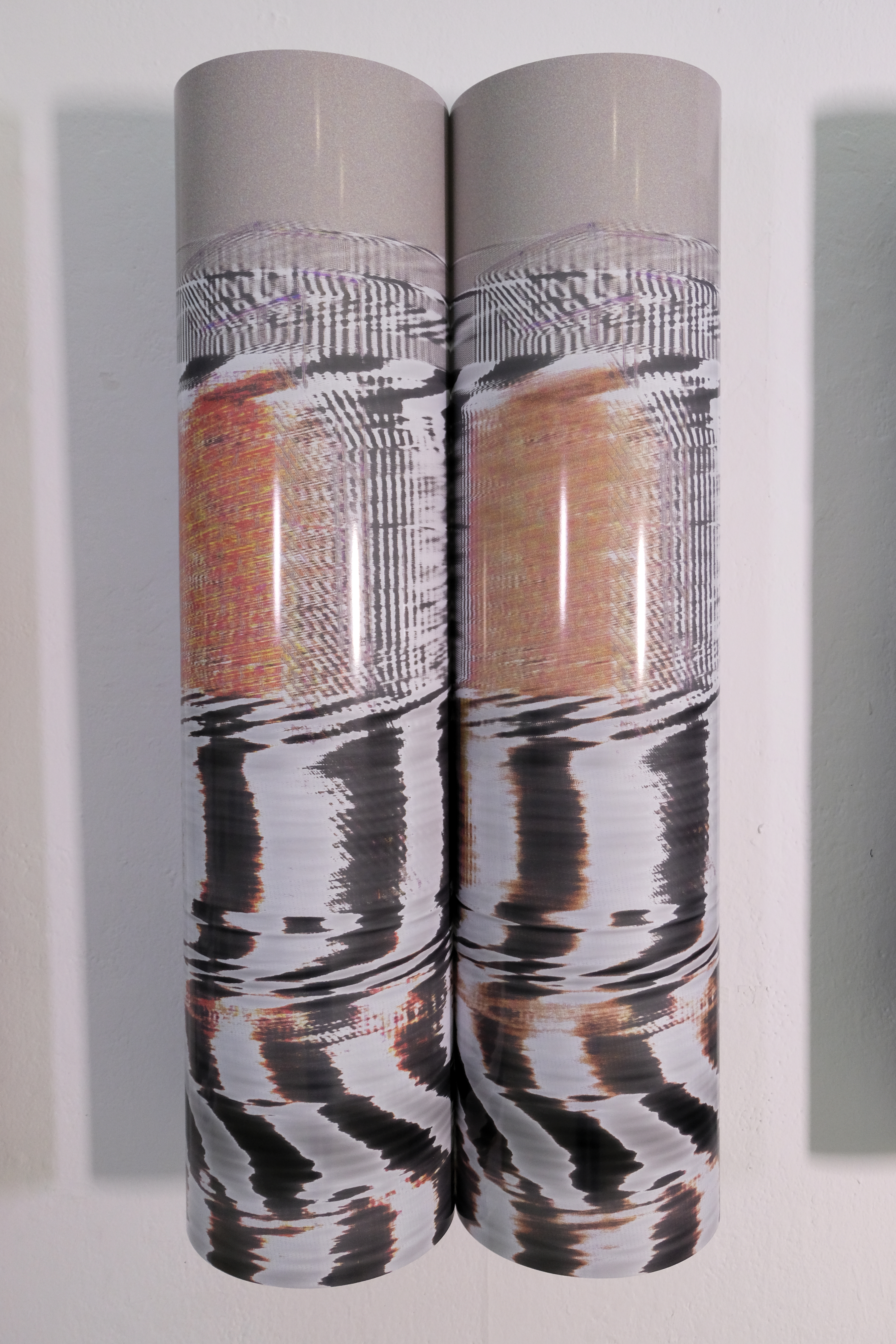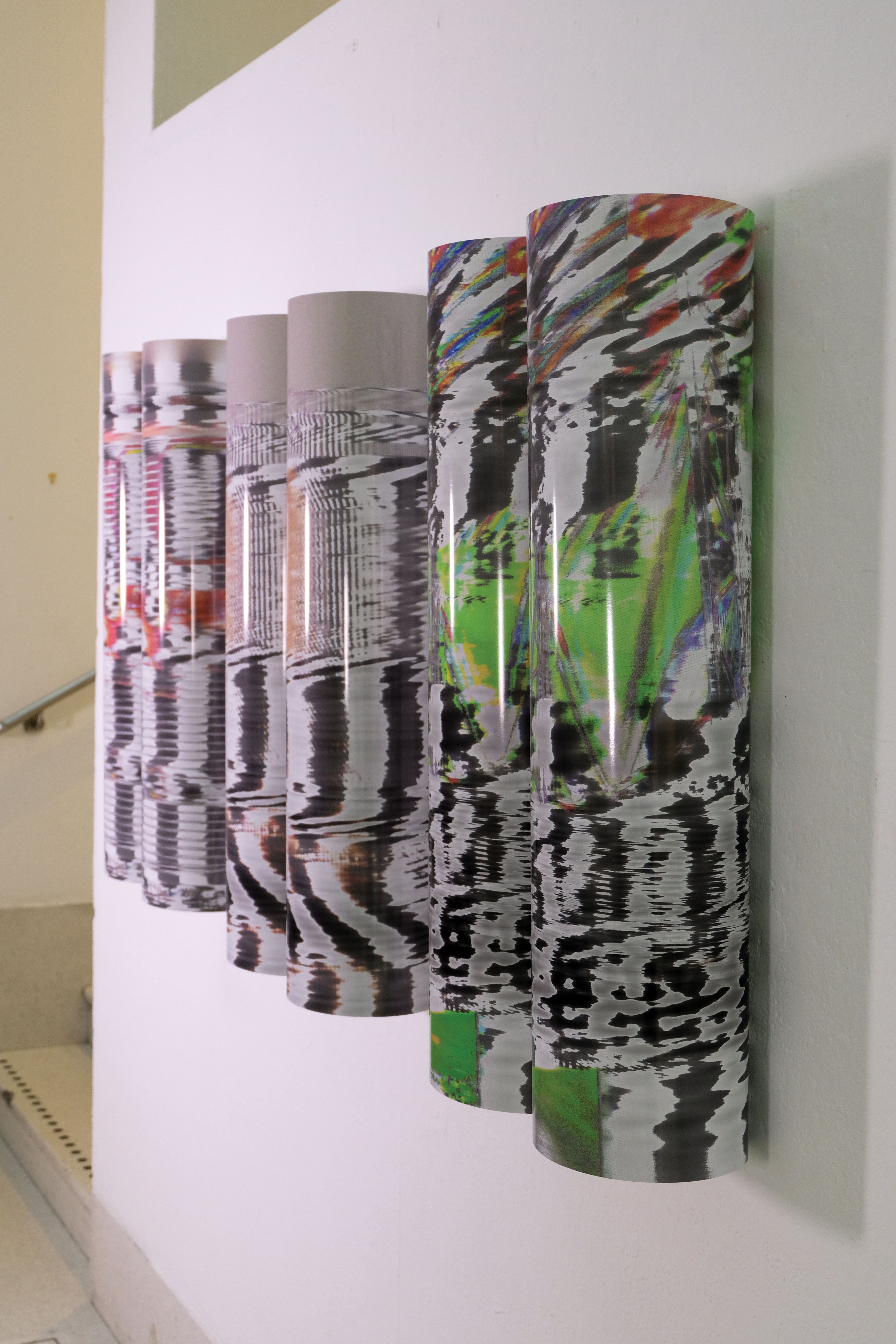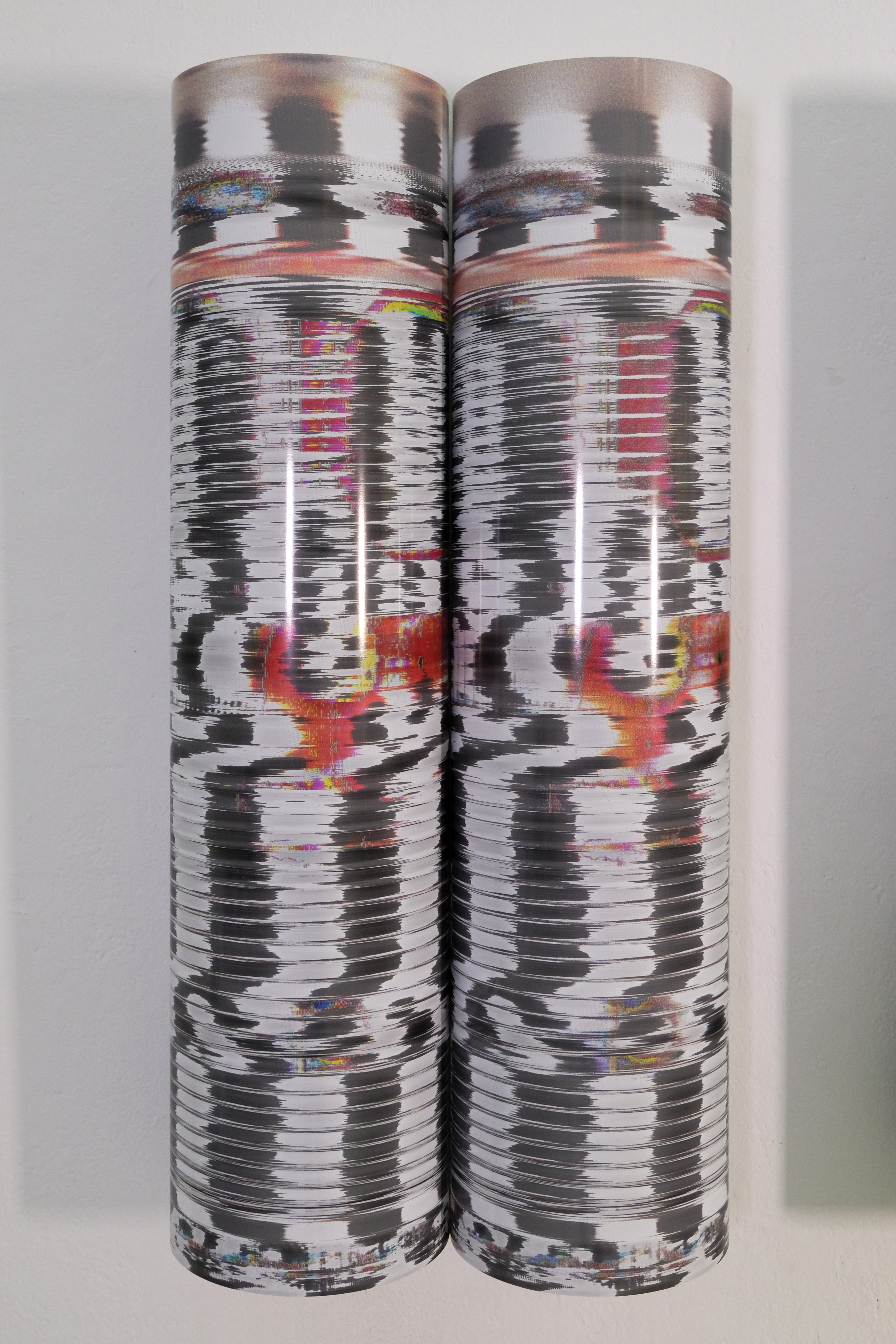 The project is executed through a series of six images printed on enhanced gloss paper in an A1 portrait format, arranged into pairs on the wall. each pair features a compressed and uncompressed version of the same photograph that has been passed through the Vocoder effect. The resulting images are glitched and stripped of narrative context with the only discernible differences being the exposed artefacts of JPEG compression. Consequently, the viewer is forced to critically examine the relationship between the images in each pair and how JPEG files lead to erasure through a form of simulacrum. This loss in visual data is further expressed through the physical curvature of the prints themselves, the images are never completely visible requiring the viewer to carefully peer around and examine details. The gloss paper, which is typically used in professional photography contexts, creates light distortions and reflections that further emphasise loss of visual information.